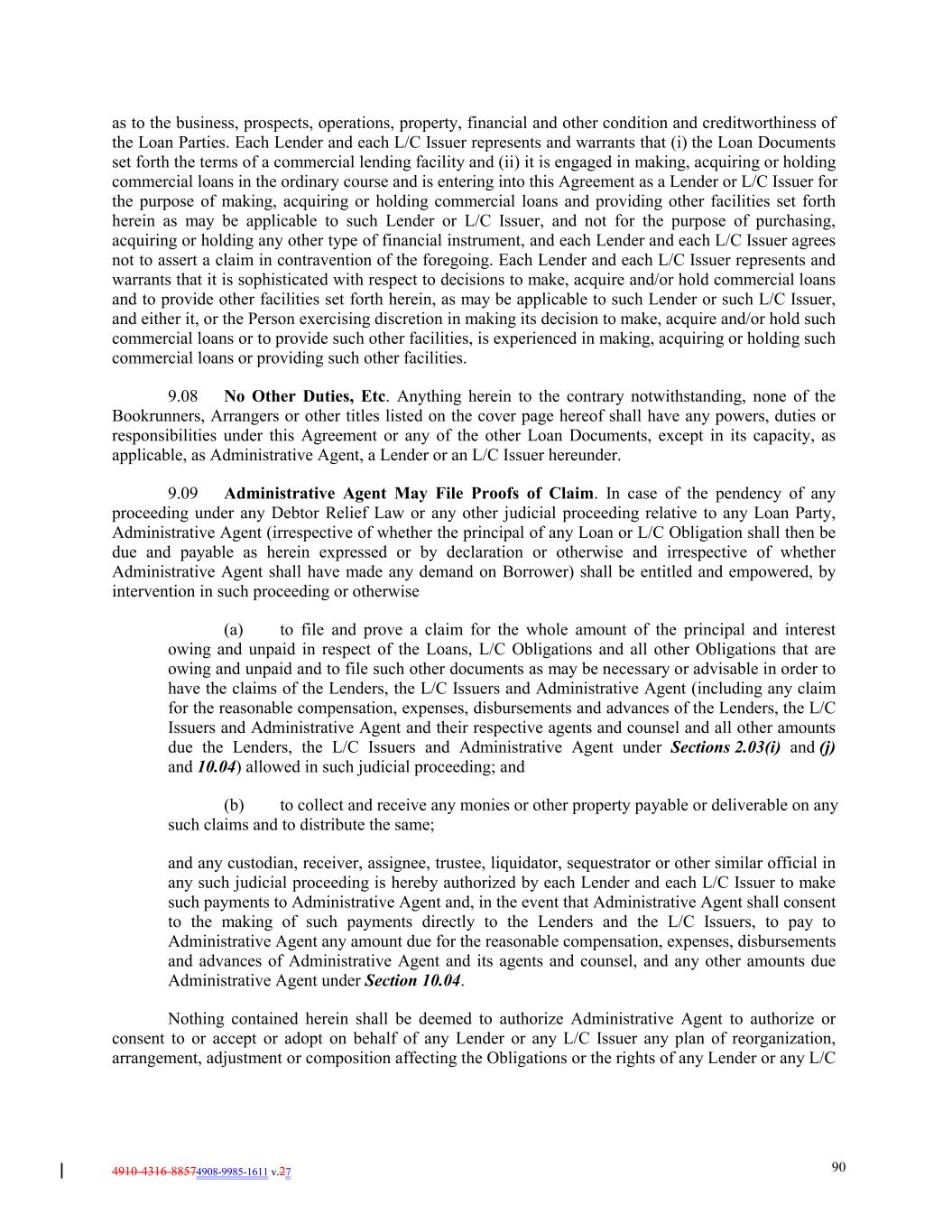 4910-4316-88574908-9985-1611 v.27 90 as to the business, prospects, operations, property, financial and other condition and creditworthiness of the Loan Parties. Each Lender and each L/C Issuer represents and warrants that (i) the Loan Documents set forth the terms of a commercial lending facility and (ii) it is engaged in making, acquiring or holding commercial loans in the ordinary course and is entering into this Agreement as a Lender or L/C Issuer for the purpose of making, acquiring or holding commercial loans and providing other facilities set forth herein as may be applicable to such Lender or L/C Issuer, and not for the purpose of purchasing, acquiring or holding any other type of financial instrument, and each Lender and each L/C Issuer agrees not to assert a claim in contravention of the foregoing. Each Lender and each L/C Issuer represents and warrants that it is sophisticated with respect to decisions to make, acquire and/or hold commercial loans and to provide other facilities set forth herein, as may be applicable to such Lender or such L/C Issuer, and either it, or the Person exercising discretion in making its decision to make, acquire and/or hold such commercial loans or to provide such other facilities, is experienced in making, acquiring or holding such commercial loans or providing such other facilities. 9.08 No Other Duties, Etc. Anything herein to the contrary notwithstanding, none of the Bookrunners, Arrangers or other titles listed on the cover page hereof shall have any powers, duties or responsibilities under this Agreement or any of the other Loan Documents, except in its capacity, as applicable, as Administrative Agent, a Lender or an L/C Issuer hereunder. 9.09 Administrative Agent May File Proofs of Claim. In case of the pendency of any proceeding under any Debtor Relief Law or any other judicial proceeding relative to any Loan Party, Administrative Agent (irrespective of whether the principal of any Loan or L/C Obligation shall then be due and payable as herein expressed or by declaration or otherwise and irrespective of whether Administrative Agent shall have made any demand on Borrower) shall be entitled and empowered, by intervention in such proceeding or otherwise (a) to file and prove a claim for the whole amount of the principal and interest owing and unpaid in respect of the Loans, L/C Obligations and all other Obligations that are owing and unpaid and to file such other documents as may be necessary or advisable in order to have the claims of the Lenders, the L/C Issuers and Administrative Agent (including any claim for the reasonable compensation, expenses, disbursements and advances of the Lenders, the L/C Issuers and Administrative Agent and their respective agents and counsel and all other amounts due the Lenders, the L/C Issuers and Administrative Agent under Sections 2.03(i) and (j) and 10.04) allowed in such judicial proceeding; and (b) to collect and receive any monies or other property payable or deliverable on any such claims and to distribute the same; and any custodian, receiver, assignee, trustee, liquidator, sequestrator or other similar official in any such judicial proceeding is hereby authorized by each Lender and each L/C Issuer to make such payments to Administrative Agent and, in the event that Administrative Agent shall consent to the making of such payments directly to the Lenders and the L/C Issuers, to pay to Administrative Agent any amount due for the reasonable compensation, expenses, disbursements and advances of Administrative Agent and its agents and counsel, and any other amounts due Administrative Agent under Section 10.04. Nothing contained herein shall be deemed to authorize Administrative Agent to authorize or consent to or accept or adopt on behalf of any Lender or any L/C Issuer any plan of reorganization, arrangement, adjustment or composition affecting the Obligations or the rights of any Lender or any L/C