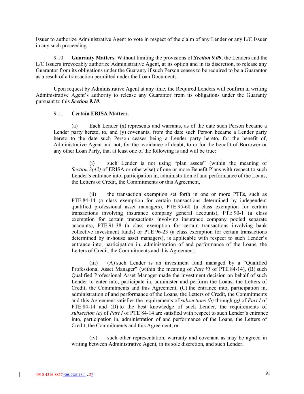 4910-4316-88574908-9985-1611 v.27 91 Issuer to authorize Administrative Agent to vote in respect of the claim of any Lender or any L/C Issuer in any such proceeding. 9.10 Guaranty Matters. Without limiting the provisions of Section 9.09, the Lenders and the L/C Issuers irrevocably authorize Administrative Agent, at its option and in its discretion, to release any Guarantor from its obligations under the Guaranty if such Person ceases to be required to be a Guarantor as a result of a transaction permitted under the Loan Documents. Upon request by Administrative Agent at any time, the Required Lenders will confirm in writing Administrative Agent’s authority to release any Guarantor from its obligations under the Guaranty pursuant to this Section 9.10. 9.11 Certain ERISA Matters. (a) Each Lender (x) represents and warrants, as of the date such Person became a Lender party hereto, to, and (y) covenants, from the date such Person became a Lender party hereto to the date such Person ceases being a Lender party hereto, for the benefit of, Administrative Agent and not, for the avoidance of doubt, to or for the benefit of Borrower or any other Loan Party, that at least one of the following is and will be true: (i) such Lender is not using “plan assets” (within the meaning of Section 3(42) of ERISA or otherwise) of one or more Benefit Plans with respect to such Lender’s entrance into, participation in, administration of and performance of the Loans, the Letters of Credit, the Commitments or this Agreement, (ii) the transaction exemption set forth in one or more PTEs, such as PTE 84-14 (a class exemption for certain transactions determined by independent qualified professional asset managers), PTE 95-60 (a class exemption for certain transactions involving insurance company general accounts), PTE 90-1 (a class exemption for certain transactions involving insurance company pooled separate accounts), PTE 91-38 (a class exemption for certain transactions involving bank collective investment funds) or PTE 96-23 (a class exemption for certain transactions determined by in-house asset managers), is applicable with respect to such Lender’s entrance into, participation in, administration of and performance of the Loans, the Letters of Credit, the Commitments and this Agreement, (iii) (A) such Lender is an investment fund managed by a “Qualified Professional Asset Manager” (within the meaning of Part VI of PTE 84-14), (B) such Qualified Professional Asset Manager made the investment decision on behalf of such Lender to enter into, participate in, administer and perform the Loans, the Letters of Credit, the Commitments and this Agreement, (C) the entrance into, participation in, administration of and performance of the Loans, the Letters of Credit, the Commitments and this Agreement satisfies the requirements of subsections (b) through (g) of Part I of PTE 84-14 and (D) to the best knowledge of such Lender, the requirements of subsection (a) of Part I of PTE 84-14 are satisfied with respect to such Lender’s entrance into, participation in, administration of and performance of the Loans, the Letters of Credit, the Commitments and this Agreement, or (iv) such other representation, warranty and covenant as may be agreed in writing between Administrative Agent, in its sole discretion, and such Lender.