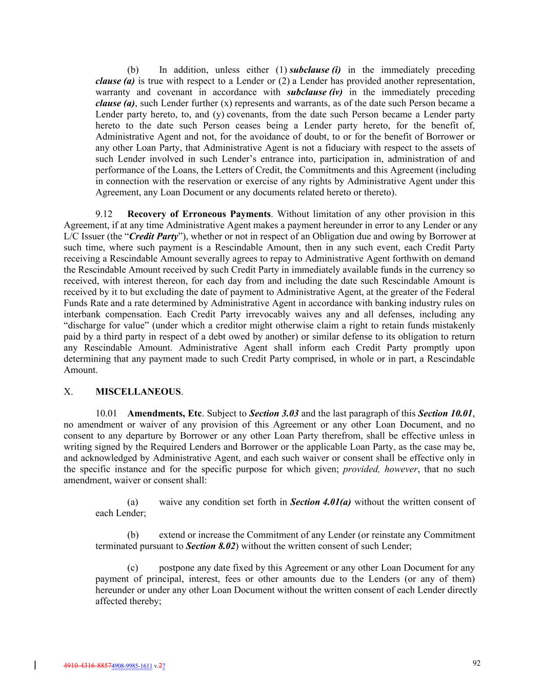 4910-4316-88574908-9985-1611 v.27 92 (b) In addition, unless either (1) subclause (i) in the immediately preceding clause (a) is true with respect to a Lender or (2) a Lender has provided another representation, warranty and covenant in accordance with subclause (iv) in the immediately preceding clause (a), such Lender further (x) represents and warrants, as of the date such Person became a Lender party hereto, to, and (y) covenants, from the date such Person became a Lender party hereto to the date such Person ceases being a Lender party hereto, for the benefit of, Administrative Agent and not, for the avoidance of doubt, to or for the benefit of Borrower or any other Loan Party, that Administrative Agent is not a fiduciary with respect to the assets of such Lender involved in such Lender’s entrance into, participation in, administration of and performance of the Loans, the Letters of Credit, the Commitments and this Agreement (including in connection with the reservation or exercise of any rights by Administrative Agent under this Agreement, any Loan Document or any documents related hereto or thereto). 9.12 Recovery of Erroneous Payments. Without limitation of any other provision in this Agreement, if at any time Administrative Agent makes a payment hereunder in error to any Lender or any L/C Issuer (the “Credit Party”), whether or not in respect of an Obligation due and owing by Borrower at such time, where such payment is a Rescindable Amount, then in any such event, each Credit Party receiving a Rescindable Amount severally agrees to repay to Administrative Agent forthwith on demand the Rescindable Amount received by such Credit Party in immediately available funds in the currency so received, with interest thereon, for each day from and including the date such Rescindable Amount is received by it to but excluding the date of payment to Administrative Agent, at the greater of the Federal Funds Rate and a rate determined by Administrative Agent in accordance with banking industry rules on interbank compensation. Each Credit Party irrevocably waives any and all defenses, including any “discharge for value” (under which a creditor might otherwise claim a right to retain funds mistakenly paid by a third party in respect of a debt owed by another) or similar defense to its obligation to return any Rescindable Amount. Administrative Agent shall inform each Credit Party promptly upon determining that any payment made to such Credit Party comprised, in whole or in part, a Rescindable Amount. X. MISCELLANEOUS. 10.01 Amendments, Etc. Subject to Section 3.03 and the last paragraph of this Section 10.01, no amendment or waiver of any provision of this Agreement or any other Loan Document, and no consent to any departure by Borrower or any other Loan Party therefrom, shall be effective unless in writing signed by the Required Lenders and Borrower or the applicable Loan Party, as the case may be, and acknowledged by Administrative Agent, and each such waiver or consent shall be effective only in the specific instance and for the specific purpose for which given; provided, however, that no such amendment, waiver or consent shall: (a) waive any condition set forth in Section 4.01(a) without the written consent of each Lender; (b) extend or increase the Commitment of any Lender (or reinstate any Commitment terminated pursuant to Section 8.02) without the written consent of such Lender; (c) postpone any date fixed by this Agreement or any other Loan Document for any payment of principal, interest, fees or other amounts due to the Lenders (or any of them) hereunder or under any other Loan Document without the written consent of each Lender directly affected thereby;