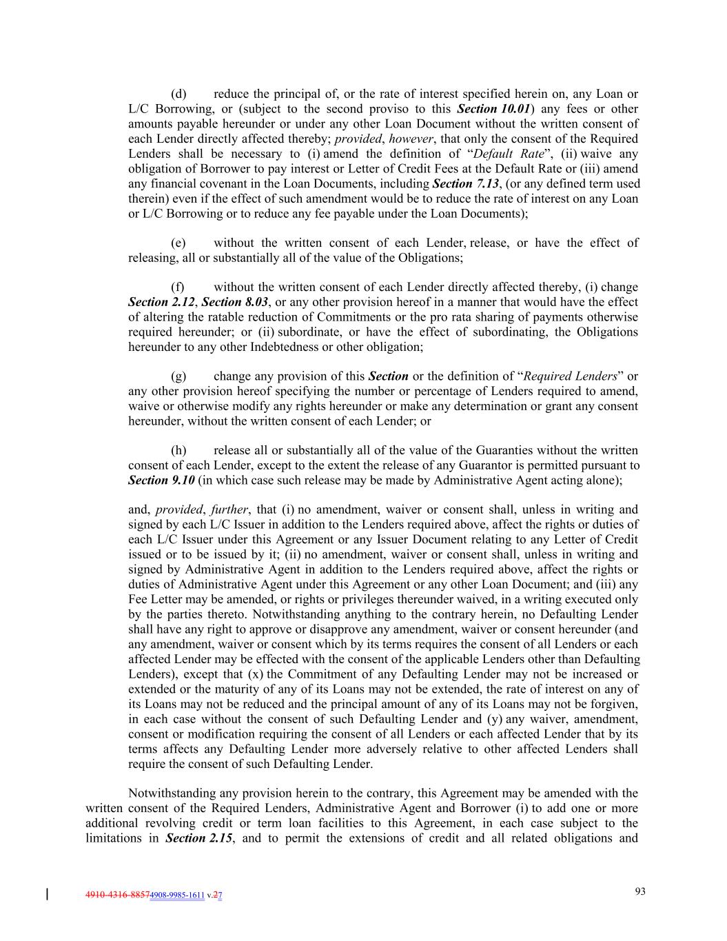 4910-4316-88574908-9985-1611 v.27 93 (d) reduce the principal of, or the rate of interest specified herein on, any Loan or L/C Borrowing, or (subject to the second proviso to this Section 10.01) any fees or other amounts payable hereunder or under any other Loan Document without the written consent of each Lender directly affected thereby; provided, however, that only the consent of the Required Lenders shall be necessary to (i) amend the definition of “Default Rate”, (ii) waive any obligation of Borrower to pay interest or Letter of Credit Fees at the Default Rate or (iii) amend any financial covenant in the Loan Documents, including Section 7.13, (or any defined term used therein) even if the effect of such amendment would be to reduce the rate of interest on any Loan or L/C Borrowing or to reduce any fee payable under the Loan Documents); (e) without the written consent of each Lender, release, or have the effect of releasing, all or substantially all of the value of the Obligations; (f) without the written consent of each Lender directly affected thereby, (i) change Section 2.12, Section 8.03, or any other provision hereof in a manner that would have the effect of altering the ratable reduction of Commitments or the pro rata sharing of payments otherwise required hereunder; or (ii) subordinate, or have the effect of subordinating, the Obligations hereunder to any other Indebtedness or other obligation; (g) change any provision of this Section or the definition of “Required Lenders” or any other provision hereof specifying the number or percentage of Lenders required to amend, waive or otherwise modify any rights hereunder or make any determination or grant any consent hereunder, without the written consent of each Lender; or (h) release all or substantially all of the value of the Guaranties without the written consent of each Lender, except to the extent the release of any Guarantor is permitted pursuant to Section 9.10 (in which case such release may be made by Administrative Agent acting alone); and, provided, further, that (i) no amendment, waiver or consent shall, unless in writing and signed by each L/C Issuer in addition to the Lenders required above, affect the rights or duties of each L/C Issuer under this Agreement or any Issuer Document relating to any Letter of Credit issued or to be issued by it; (ii) no amendment, waiver or consent shall, unless in writing and signed by Administrative Agent in addition to the Lenders required above, affect the rights or duties of Administrative Agent under this Agreement or any other Loan Document; and (iii) any Fee Letter may be amended, or rights or privileges thereunder waived, in a writing executed only by the parties thereto. Notwithstanding anything to the contrary herein, no Defaulting Lender shall have any right to approve or disapprove any amendment, waiver or consent hereunder (and any amendment, waiver or consent which by its terms requires the consent of all Lenders or each affected Lender may be effected with the consent of the applicable Lenders other than Defaulting Lenders), except that (x) the Commitment of any Defaulting Lender may not be increased or extended or the maturity of any of its Loans may not be extended, the rate of interest on any of its Loans may not be reduced and the principal amount of any of its Loans may not be forgiven, in each case without the consent of such Defaulting Lender and (y) any waiver, amendment, consent or modification requiring the consent of all Lenders or each affected Lender that by its terms affects any Defaulting Lender more adversely relative to other affected Lenders shall require the consent of such Defaulting Lender. Notwithstanding any provision herein to the contrary, this Agreement may be amended with the written consent of the Required Lenders, Administrative Agent and Borrower (i) to add one or more additional revolving credit or term loan facilities to this Agreement, in each case subject to the limitations in Section 2.15, and to permit the extensions of credit and all related obligations and