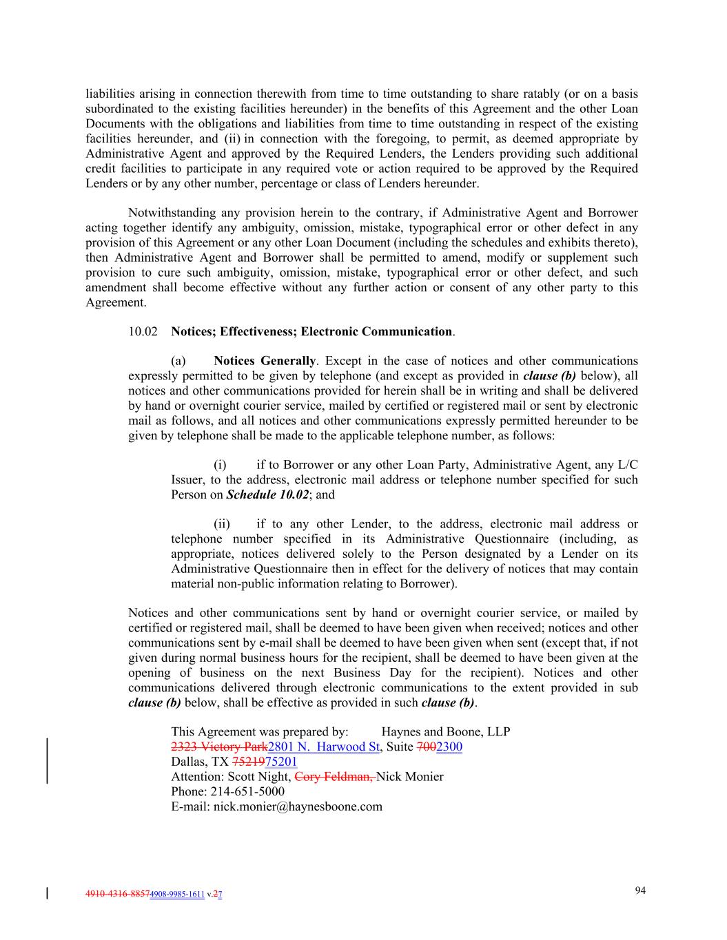 4910-4316-88574908-9985-1611 v.27 94 liabilities arising in connection therewith from time to time outstanding to share ratably (or on a basis subordinated to the existing facilities hereunder) in the benefits of this Agreement and the other Loan Documents with the obligations and liabilities from time to time outstanding in respect of the existing facilities hereunder, and (ii) in connection with the foregoing, to permit, as deemed appropriate by Administrative Agent and approved by the Required Lenders, the Lenders providing such additional credit facilities to participate in any required vote or action required to be approved by the Required Lenders or by any other number, percentage or class of Lenders hereunder. Notwithstanding any provision herein to the contrary, if Administrative Agent and Borrower acting together identify any ambiguity, omission, mistake, typographical error or other defect in any provision of this Agreement or any other Loan Document (including the schedules and exhibits thereto), then Administrative Agent and Borrower shall be permitted to amend, modify or supplement such provision to cure such ambiguity, omission, mistake, typographical error or other defect, and such amendment shall become effective without any further action or consent of any other party to this Agreement. 10.02 Notices; Effectiveness; Electronic Communication. (a) Notices Generally. Except in the case of notices and other communications expressly permitted to be given by telephone (and except as provided in clause (b) below), all notices and other communications provided for herein shall be in writing and shall be delivered by hand or overnight courier service, mailed by certified or registered mail or sent by electronic mail as follows, and all notices and other communications expressly permitted hereunder to be given by telephone shall be made to the applicable telephone number, as follows: (i) if to Borrower or any other Loan Party, Administrative Agent, any L/C Issuer, to the address, electronic mail address or telephone number specified for such Person on Schedule 10.02; and (ii) if to any other Lender, to the address, electronic mail address or telephone number specified in its Administrative Questionnaire (including, as appropriate, notices delivered solely to the Person designated by a Lender on its Administrative Questionnaire then in effect for the delivery of notices that may contain material non-public information relating to Borrower). Notices and other communications sent by hand or overnight courier service, or mailed by certified or registered mail, shall be deemed to have been given when received; notices and other communications sent by e-mail shall be deemed to have been given when sent (except that, if not given during normal business hours for the recipient, shall be deemed to have been given at the opening of business on the next Business Day for the recipient). Notices and other communications delivered through electronic communications to the extent provided in sub clause (b) below, shall be effective as provided in such clause (b). This Agreement was prepared by: Haynes and Boone, LLP 2323 Victory Park2801 N. Harwood St, Suite 7002300 Dallas, TX 7521975201 Attention: Scott Night, Cory Feldman, Nick Monier Phone: 214-651-5000 E-mail: nick.monier@haynesboone.com