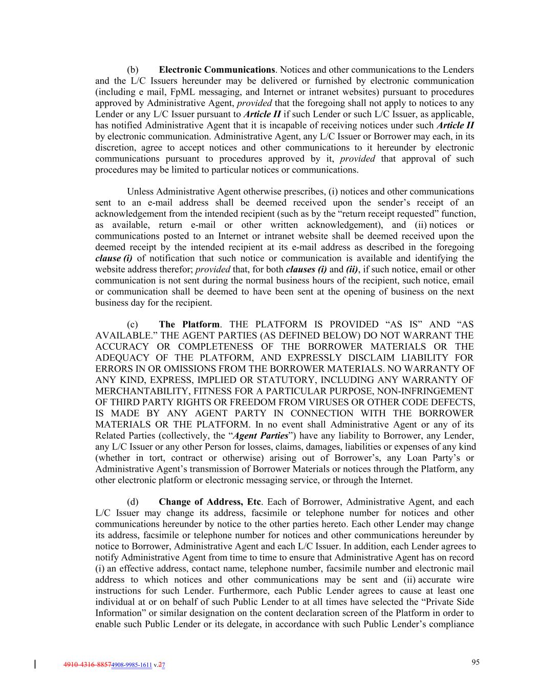 4910-4316-88574908-9985-1611 v.27 95 (b) Electronic Communications. Notices and other communications to the Lenders and the L/C Issuers hereunder may be delivered or furnished by electronic communication (including e mail, FpML messaging, and Internet or intranet websites) pursuant to procedures approved by Administrative Agent, provided that the foregoing shall not apply to notices to any Lender or any L/C Issuer pursuant to Article II if such Lender or such L/C Issuer, as applicable, has notified Administrative Agent that it is incapable of receiving notices under such Article II by electronic communication. Administrative Agent, any L/C Issuer or Borrower may each, in its discretion, agree to accept notices and other communications to it hereunder by electronic communications pursuant to procedures approved by it, provided that approval of such procedures may be limited to particular notices or communications. Unless Administrative Agent otherwise prescribes, (i) notices and other communications sent to an e-mail address shall be deemed received upon the sender’s receipt of an acknowledgement from the intended recipient (such as by the “return receipt requested” function, as available, return e-mail or other written acknowledgement), and (ii) notices or communications posted to an Internet or intranet website shall be deemed received upon the deemed receipt by the intended recipient at its e-mail address as described in the foregoing clause (i) of notification that such notice or communication is available and identifying the website address therefor; provided that, for both clauses (i) and (ii), if such notice, email or other communication is not sent during the normal business hours of the recipient, such notice, email or communication shall be deemed to have been sent at the opening of business on the next business day for the recipient. (c) The Platform. THE PLATFORM IS PROVIDED “AS IS” AND “AS AVAILABLE.” THE AGENT PARTIES (AS DEFINED BELOW) DO NOT WARRANT THE ACCURACY OR COMPLETENESS OF THE BORROWER MATERIALS OR THE ADEQUACY OF THE PLATFORM, AND EXPRESSLY DISCLAIM LIABILITY FOR ERRORS IN OR OMISSIONS FROM THE BORROWER MATERIALS. NO WARRANTY OF ANY KIND, EXPRESS, IMPLIED OR STATUTORY, INCLUDING ANY WARRANTY OF MERCHANTABILITY, FITNESS FOR A PARTICULAR PURPOSE, NON-INFRINGEMENT OF THIRD PARTY RIGHTS OR FREEDOM FROM VIRUSES OR OTHER CODE DEFECTS, IS MADE BY ANY AGENT PARTY IN CONNECTION WITH THE BORROWER MATERIALS OR THE PLATFORM. In no event shall Administrative Agent or any of its Related Parties (collectively, the “Agent Parties”) have any liability to Borrower, any Lender, any L/C Issuer or any other Person for losses, claims, damages, liabilities or expenses of any kind (whether in tort, contract or otherwise) arising out of Borrower’s, any Loan Party’s or Administrative Agent’s transmission of Borrower Materials or notices through the Platform, any other electronic platform or electronic messaging service, or through the Internet. (d) Change of Address, Etc. Each of Borrower, Administrative Agent, and each L/C Issuer may change its address, facsimile or telephone number for notices and other communications hereunder by notice to the other parties hereto. Each other Lender may change its address, facsimile or telephone number for notices and other communications hereunder by notice to Borrower, Administrative Agent and each L/C Issuer. In addition, each Lender agrees to notify Administrative Agent from time to time to ensure that Administrative Agent has on record (i) an effective address, contact name, telephone number, facsimile number and electronic mail address to which notices and other communications may be sent and (ii) accurate wire instructions for such Lender. Furthermore, each Public Lender agrees to cause at least one individual at or on behalf of such Public Lender to at all times have selected the “Private Side Information” or similar designation on the content declaration screen of the Platform in order to enable such Public Lender or its delegate, in accordance with such Public Lender’s compliance
