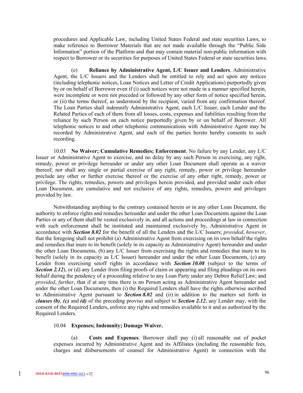 4910-4316-88574908-9985-1611 v.27 96 procedures and Applicable Law, including United States Federal and state securities Laws, to make reference to Borrower Materials that are not made available through the “Public Side Information” portion of the Platform and that may contain material non-public information with respect to Borrower or its securities for purposes of United States Federal or state securities laws. (e) Reliance by Administrative Agent, L/C Issuer and Lenders. Administrative Agent, the L/C Issuers and the Lenders shall be entitled to rely and act upon any notices (including telephonic notices, Loan Notices and Letter of Credit Applications) purportedly given by or on behalf of Borrower even if (i) such notices were not made in a manner specified herein, were incomplete or were not preceded or followed by any other form of notice specified herein, or (ii) the terms thereof, as understood by the recipient, varied from any confirmation thereof. The Loan Parties shall indemnify Administrative Agent, each L/C Issuer, each Lender and the Related Parties of each of them from all losses, costs, expenses and liabilities resulting from the reliance by such Person on each notice purportedly given by or on behalf of Borrower. All telephonic notices to and other telephonic communications with Administrative Agent may be recorded by Administrative Agent, and each of the parties hereto hereby consents to such recording. 10.03 No Waiver; Cumulative Remedies; Enforcement. No failure by any Lender, any L/C Issuer or Administrative Agent to exercise, and no delay by any such Person in exercising, any right, remedy, power or privilege hereunder or under any other Loan Document shall operate as a waiver thereof; nor shall any single or partial exercise of any right, remedy, power or privilege hereunder preclude any other or further exercise thereof or the exercise of any other right, remedy, power or privilege. The rights, remedies, powers and privileges herein provided, and provided under each other Loan Document, are cumulative and not exclusive of any rights, remedies, powers and privileges provided by law. Notwithstanding anything to the contrary contained herein or in any other Loan Document, the authority to enforce rights and remedies hereunder and under the other Loan Documents against the Loan Parties or any of them shall be vested exclusively in, and all actions and proceedings at law in connection with such enforcement shall be instituted and maintained exclusively by, Administrative Agent in accordance with Section 8.02 for the benefit of all the Lenders and the L/C Issuers; provided, however, that the foregoing shall not prohibit (a) Administrative Agent from exercising on its own behalf the rights and remedies that inure to its benefit (solely in its capacity as Administrative Agent) hereunder and under the other Loan Documents, (b) any L/C Issuer from exercising the rights and remedies that inure to its benefit (solely in its capacity as L/C Issuer) hereunder and under the other Loan Documents, (c) any Lender from exercising setoff rights in accordance with Section 10.08 (subject to the terms of Section 2.12), or (d) any Lender from filing proofs of claim or appearing and filing pleadings on its own behalf during the pendency of a proceeding relative to any Loan Party under any Debtor Relief Law; and provided, further, that if at any time there is no Person acting as Administrative Agent hereunder and under the other Loan Documents, then (i) the Required Lenders shall have the rights otherwise ascribed to Administrative Agent pursuant to Section 8.02 and (ii) in addition to the matters set forth in clauses (b), (c) and (d) of the preceding proviso and subject to Section 2.12, any Lender may, with the consent of the Required Lenders, enforce any rights and remedies available to it and as authorized by the Required Lenders. 10.04 Expenses; Indemnity; Damage Waiver. (a) Costs and Expenses. Borrower shall pay (i) all reasonable out of pocket expenses incurred by Administrative Agent and its Affiliates (including the reasonable fees, charges and disbursements of counsel for Administrative Agent) in connection with the