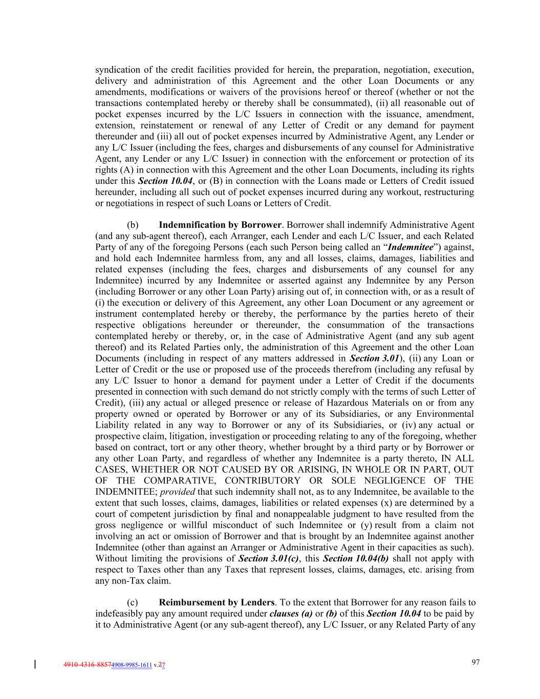 4910-4316-88574908-9985-1611 v.27 97 syndication of the credit facilities provided for herein, the preparation, negotiation, execution, delivery and administration of this Agreement and the other Loan Documents or any amendments, modifications or waivers of the provisions hereof or thereof (whether or not the transactions contemplated hereby or thereby shall be consummated), (ii) all reasonable out of pocket expenses incurred by the L/C Issuers in connection with the issuance, amendment, extension, reinstatement or renewal of any Letter of Credit or any demand for payment thereunder and (iii) all out of pocket expenses incurred by Administrative Agent, any Lender or any L/C Issuer (including the fees, charges and disbursements of any counsel for Administrative Agent, any Lender or any L/C Issuer) in connection with the enforcement or protection of its rights (A) in connection with this Agreement and the other Loan Documents, including its rights under this Section 10.04, or (B) in connection with the Loans made or Letters of Credit issued hereunder, including all such out of pocket expenses incurred during any workout, restructuring or negotiations in respect of such Loans or Letters of Credit. (b) Indemnification by Borrower. Borrower shall indemnify Administrative Agent (and any sub-agent thereof), each Arranger, each Lender and each L/C Issuer, and each Related Party of any of the foregoing Persons (each such Person being called an “Indemnitee”) against, and hold each Indemnitee harmless from, any and all losses, claims, damages, liabilities and related expenses (including the fees, charges and disbursements of any counsel for any Indemnitee) incurred by any Indemnitee or asserted against any Indemnitee by any Person (including Borrower or any other Loan Party) arising out of, in connection with, or as a result of (i) the execution or delivery of this Agreement, any other Loan Document or any agreement or instrument contemplated hereby or thereby, the performance by the parties hereto of their respective obligations hereunder or thereunder, the consummation of the transactions contemplated hereby or thereby, or, in the case of Administrative Agent (and any sub agent thereof) and its Related Parties only, the administration of this Agreement and the other Loan Documents (including in respect of any matters addressed in Section 3.01), (ii) any Loan or Letter of Credit or the use or proposed use of the proceeds therefrom (including any refusal by any L/C Issuer to honor a demand for payment under a Letter of Credit if the documents presented in connection with such demand do not strictly comply with the terms of such Letter of Credit), (iii) any actual or alleged presence or release of Hazardous Materials on or from any property owned or operated by Borrower or any of its Subsidiaries, or any Environmental Liability related in any way to Borrower or any of its Subsidiaries, or (iv) any actual or prospective claim, litigation, investigation or proceeding relating to any of the foregoing, whether based on contract, tort or any other theory, whether brought by a third party or by Borrower or any other Loan Party, and regardless of whether any Indemnitee is a party thereto, IN ALL CASES, WHETHER OR NOT CAUSED BY OR ARISING, IN WHOLE OR IN PART, OUT OF THE COMPARATIVE, CONTRIBUTORY OR SOLE NEGLIGENCE OF THE INDEMNITEE; provided that such indemnity shall not, as to any Indemnitee, be available to the extent that such losses, claims, damages, liabilities or related expenses (x) are determined by a court of competent jurisdiction by final and nonappealable judgment to have resulted from the gross negligence or willful misconduct of such Indemnitee or (y) result from a claim not involving an act or omission of Borrower and that is brought by an Indemnitee against another Indemnitee (other than against an Arranger or Administrative Agent in their capacities as such). Without limiting the provisions of Section 3.01(c), this Section 10.04(b) shall not apply with respect to Taxes other than any Taxes that represent losses, claims, damages, etc. arising from any non-Tax claim. (c) Reimbursement by Lenders. To the extent that Borrower for any reason fails to indefeasibly pay any amount required under clauses (a) or (b) of this Section 10.04 to be paid by it to Administrative Agent (or any sub-agent thereof), any L/C Issuer, or any Related Party of any