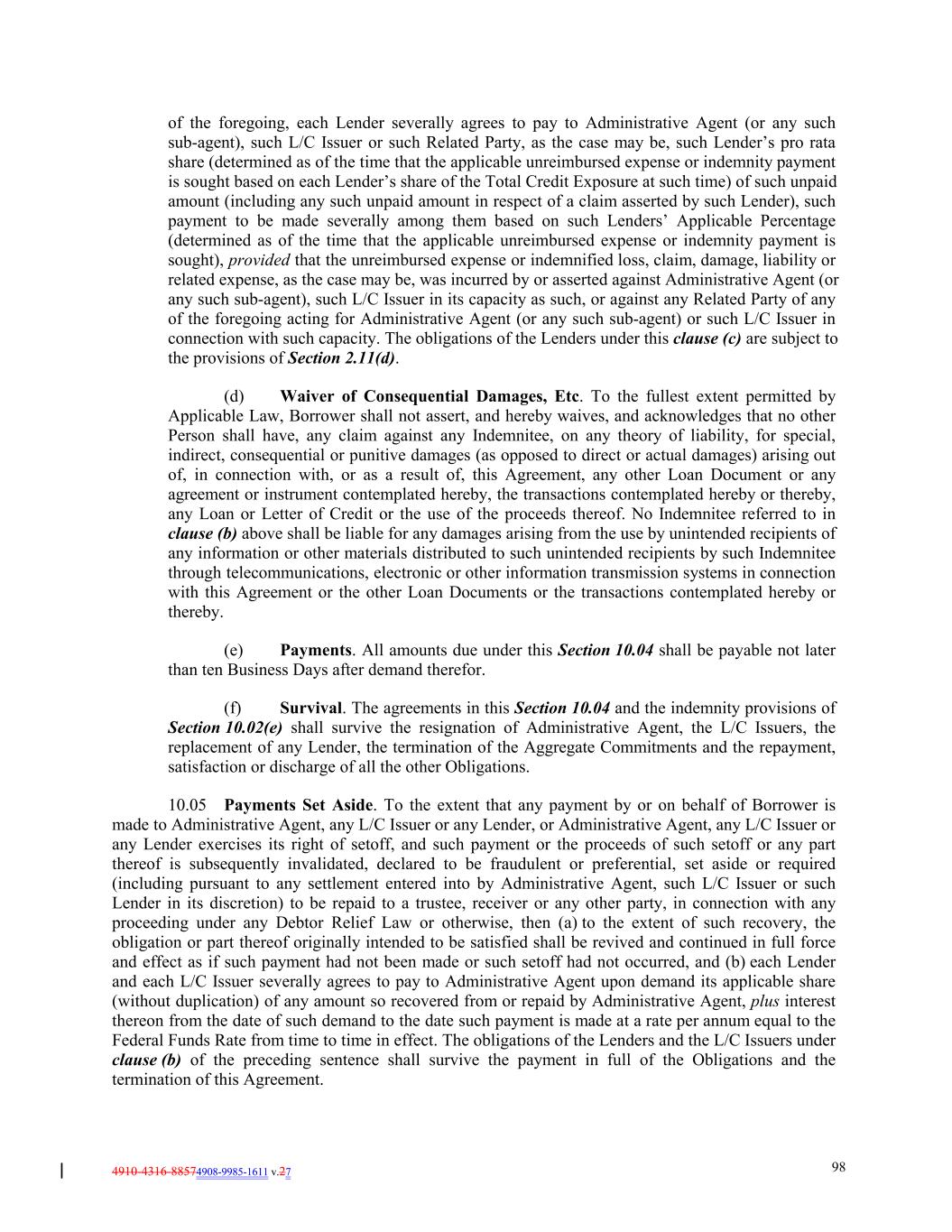 4910-4316-88574908-9985-1611 v.27 98 of the foregoing, each Lender severally agrees to pay to Administrative Agent (or any such sub-agent), such L/C Issuer or such Related Party, as the case may be, such Lender’s pro rata share (determined as of the time that the applicable unreimbursed expense or indemnity payment is sought based on each Lender’s share of the Total Credit Exposure at such time) of such unpaid amount (including any such unpaid amount in respect of a claim asserted by such Lender), such payment to be made severally among them based on such Lenders’ Applicable Percentage (determined as of the time that the applicable unreimbursed expense or indemnity payment is sought), provided that the unreimbursed expense or indemnified loss, claim, damage, liability or related expense, as the case may be, was incurred by or asserted against Administrative Agent (or any such sub-agent), such L/C Issuer in its capacity as such, or against any Related Party of any of the foregoing acting for Administrative Agent (or any such sub-agent) or such L/C Issuer in connection with such capacity. The obligations of the Lenders under this clause (c) are subject to the provisions of Section 2.11(d). (d) Waiver of Consequential Damages, Etc. To the fullest extent permitted by Applicable Law, Borrower shall not assert, and hereby waives, and acknowledges that no other Person shall have, any claim against any Indemnitee, on any theory of liability, for special, indirect, consequential or punitive damages (as opposed to direct or actual damages) arising out of, in connection with, or as a result of, this Agreement, any other Loan Document or any agreement or instrument contemplated hereby, the transactions contemplated hereby or thereby, any Loan or Letter of Credit or the use of the proceeds thereof. No Indemnitee referred to in clause (b) above shall be liable for any damages arising from the use by unintended recipients of any information or other materials distributed to such unintended recipients by such Indemnitee through telecommunications, electronic or other information transmission systems in connection with this Agreement or the other Loan Documents or the transactions contemplated hereby or thereby. (e) Payments. All amounts due under this Section 10.04 shall be payable not later than ten Business Days after demand therefor. (f) Survival. The agreements in this Section 10.04 and the indemnity provisions of Section 10.02(e) shall survive the resignation of Administrative Agent, the L/C Issuers, the replacement of any Lender, the termination of the Aggregate Commitments and the repayment, satisfaction or discharge of all the other Obligations. 10.05 Payments Set Aside. To the extent that any payment by or on behalf of Borrower is made to Administrative Agent, any L/C Issuer or any Lender, or Administrative Agent, any L/C Issuer or any Lender exercises its right of setoff, and such payment or the proceeds of such setoff or any part thereof is subsequently invalidated, declared to be fraudulent or preferential, set aside or required (including pursuant to any settlement entered into by Administrative Agent, such L/C Issuer or such Lender in its discretion) to be repaid to a trustee, receiver or any other party, in connection with any proceeding under any Debtor Relief Law or otherwise, then (a) to the extent of such recovery, the obligation or part thereof originally intended to be satisfied shall be revived and continued in full force and effect as if such payment had not been made or such setoff had not occurred, and (b) each Lender and each L/C Issuer severally agrees to pay to Administrative Agent upon demand its applicable share (without duplication) of any amount so recovered from or repaid by Administrative Agent, plus interest thereon from the date of such demand to the date such payment is made at a rate per annum equal to the Federal Funds Rate from time to time in effect. The obligations of the Lenders and the L/C Issuers under clause (b) of the preceding sentence shall survive the payment in full of the Obligations and the termination of this Agreement.