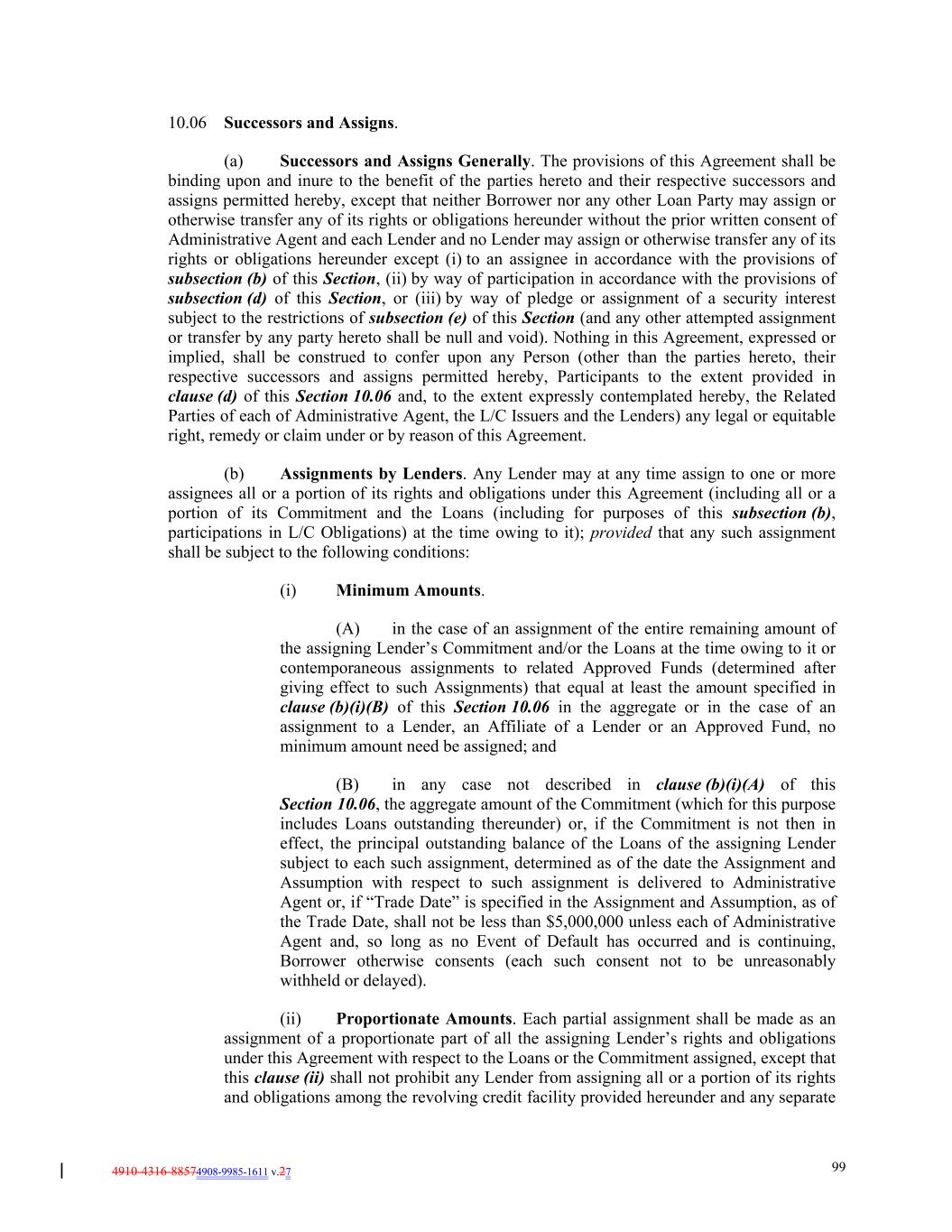 4910-4316-88574908-9985-1611 v.27 99 10.06 Successors and Assigns. (a) Successors and Assigns Generally. The provisions of this Agreement shall be binding upon and inure to the benefit of the parties hereto and their respective successors and assigns permitted hereby, except that neither Borrower nor any other Loan Party may assign or otherwise transfer any of its rights or obligations hereunder without the prior written consent of Administrative Agent and each Lender and no Lender may assign or otherwise transfer any of its rights or obligations hereunder except (i) to an assignee in accordance with the provisions of subsection (b) of this Section, (ii) by way of participation in accordance with the provisions of subsection (d) of this Section, or (iii) by way of pledge or assignment of a security interest subject to the restrictions of subsection (e) of this Section (and any other attempted assignment or transfer by any party hereto shall be null and void). Nothing in this Agreement, expressed or implied, shall be construed to confer upon any Person (other than the parties hereto, their respective successors and assigns permitted hereby, Participants to the extent provided in clause (d) of this Section 10.06 and, to the extent expressly contemplated hereby, the Related Parties of each of Administrative Agent, the L/C Issuers and the Lenders) any legal or equitable right, remedy or claim under or by reason of this Agreement. (b) Assignments by Lenders. Any Lender may at any time assign to one or more assignees all or a portion of its rights and obligations under this Agreement (including all or a portion of its Commitment and the Loans (including for purposes of this subsection (b), participations in L/C Obligations) at the time owing to it); provided that any such assignment shall be subject to the following conditions: (i) Minimum Amounts. (A) in the case of an assignment of the entire remaining amount of the assigning Lender’s Commitment and/or the Loans at the time owing to it or contemporaneous assignments to related Approved Funds (determined after giving effect to such Assignments) that equal at least the amount specified in clause (b)(i)(B) of this Section 10.06 in the aggregate or in the case of an assignment to a Lender, an Affiliate of a Lender or an Approved Fund, no minimum amount need be assigned; and (B) in any case not described in clause (b)(i)(A) of this Section 10.06, the aggregate amount of the Commitment (which for this purpose includes Loans outstanding thereunder) or, if the Commitment is not then in effect, the principal outstanding balance of the Loans of the assigning Lender subject to each such assignment, determined as of the date the Assignment and Assumption with respect to such assignment is delivered to Administrative Agent or, if “Trade Date” is specified in the Assignment and Assumption, as of the Trade Date, shall not be less than $5,000,000 unless each of Administrative Agent and, so long as no Event of Default has occurred and is continuing, Borrower otherwise consents (each such consent not to be unreasonably withheld or delayed). (ii) Proportionate Amounts. Each partial assignment shall be made as an assignment of a proportionate part of all the assigning Lender’s rights and obligations under this Agreement with respect to the Loans or the Commitment assigned, except that this clause (ii) shall not prohibit any Lender from assigning all or a portion of its rights and obligations among the revolving credit facility provided hereunder and any separate