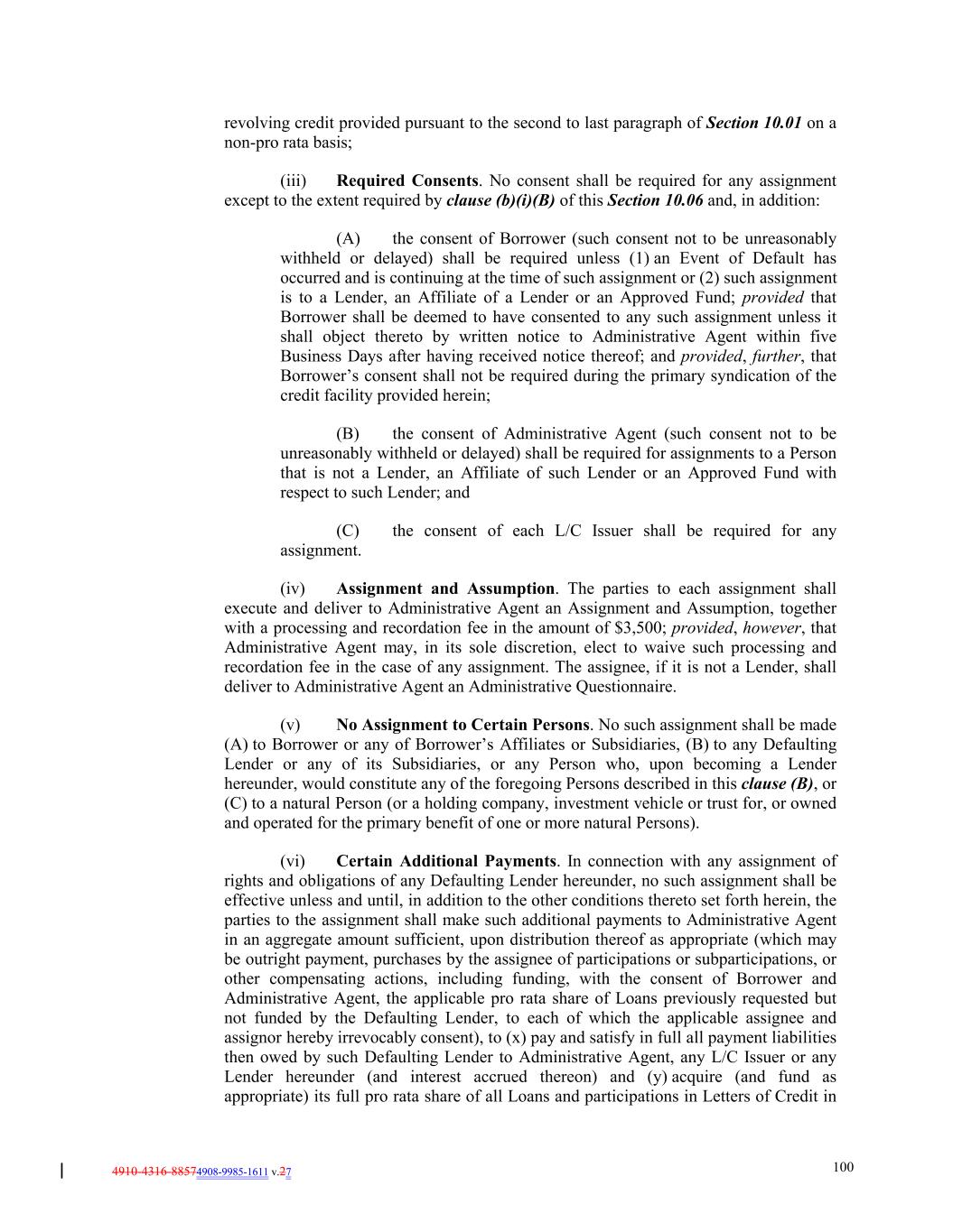 4910-4316-88574908-9985-1611 v.27 100 revolving credit provided pursuant to the second to last paragraph of Section 10.01 on a non-pro rata basis; (iii) Required Consents. No consent shall be required for any assignment except to the extent required by clause (b)(i)(B) of this Section 10.06 and, in addition: (A) the consent of Borrower (such consent not to be unreasonably withheld or delayed) shall be required unless (1) an Event of Default has occurred and is continuing at the time of such assignment or (2) such assignment is to a Lender, an Affiliate of a Lender or an Approved Fund; provided that Borrower shall be deemed to have consented to any such assignment unless it shall object thereto by written notice to Administrative Agent within five Business Days after having received notice thereof; and provided, further, that Borrower’s consent shall not be required during the primary syndication of the credit facility provided herein; (B) the consent of Administrative Agent (such consent not to be unreasonably withheld or delayed) shall be required for assignments to a Person that is not a Lender, an Affiliate of such Lender or an Approved Fund with respect to such Lender; and (C) the consent of each L/C Issuer shall be required for any assignment. (iv) Assignment and Assumption. The parties to each assignment shall execute and deliver to Administrative Agent an Assignment and Assumption, together with a processing and recordation fee in the amount of $3,500; provided, however, that Administrative Agent may, in its sole discretion, elect to waive such processing and recordation fee in the case of any assignment. The assignee, if it is not a Lender, shall deliver to Administrative Agent an Administrative Questionnaire. (v) No Assignment to Certain Persons. No such assignment shall be made (A) to Borrower or any of Borrower’s Affiliates or Subsidiaries, (B) to any Defaulting Lender or any of its Subsidiaries, or any Person who, upon becoming a Lender hereunder, would constitute any of the foregoing Persons described in this clause (B), or (C) to a natural Person (or a holding company, investment vehicle or trust for, or owned and operated for the primary benefit of one or more natural Persons). (vi) Certain Additional Payments. In connection with any assignment of rights and obligations of any Defaulting Lender hereunder, no such assignment shall be effective unless and until, in addition to the other conditions thereto set forth herein, the parties to the assignment shall make such additional payments to Administrative Agent in an aggregate amount sufficient, upon distribution thereof as appropriate (which may be outright payment, purchases by the assignee of participations or subparticipations, or other compensating actions, including funding, with the consent of Borrower and Administrative Agent, the applicable pro rata share of Loans previously requested but not funded by the Defaulting Lender, to each of which the applicable assignee and assignor hereby irrevocably consent), to (x) pay and satisfy in full all payment liabilities then owed by such Defaulting Lender to Administrative Agent, any L/C Issuer or any Lender hereunder (and interest accrued thereon) and (y) acquire (and fund as appropriate) its full pro rata share of all Loans and participations in Letters of Credit in