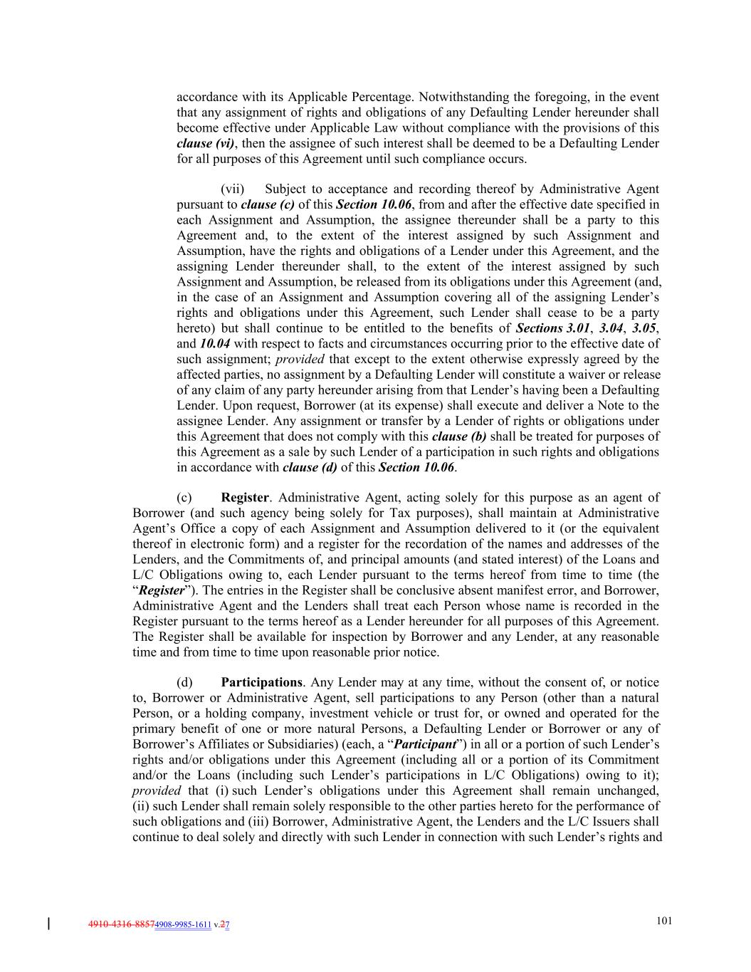 4910-4316-88574908-9985-1611 v.27 101 accordance with its Applicable Percentage. Notwithstanding the foregoing, in the event that any assignment of rights and obligations of any Defaulting Lender hereunder shall become effective under Applicable Law without compliance with the provisions of this clause (vi), then the assignee of such interest shall be deemed to be a Defaulting Lender for all purposes of this Agreement until such compliance occurs. (vii) Subject to acceptance and recording thereof by Administrative Agent pursuant to clause (c) of this Section 10.06, from and after the effective date specified in each Assignment and Assumption, the assignee thereunder shall be a party to this Agreement and, to the extent of the interest assigned by such Assignment and Assumption, have the rights and obligations of a Lender under this Agreement, and the assigning Lender thereunder shall, to the extent of the interest assigned by such Assignment and Assumption, be released from its obligations under this Agreement (and, in the case of an Assignment and Assumption covering all of the assigning Lender’s rights and obligations under this Agreement, such Lender shall cease to be a party hereto) but shall continue to be entitled to the benefits of Sections 3.01, 3.04, 3.05, and 10.04 with respect to facts and circumstances occurring prior to the effective date of such assignment; provided that except to the extent otherwise expressly agreed by the affected parties, no assignment by a Defaulting Lender will constitute a waiver or release of any claim of any party hereunder arising from that Lender’s having been a Defaulting Lender. Upon request, Borrower (at its expense) shall execute and deliver a Note to the assignee Lender. Any assignment or transfer by a Lender of rights or obligations under this Agreement that does not comply with this clause (b) shall be treated for purposes of this Agreement as a sale by such Lender of a participation in such rights and obligations in accordance with clause (d) of this Section 10.06. (c) Register. Administrative Agent, acting solely for this purpose as an agent of Borrower (and such agency being solely for Tax purposes), shall maintain at Administrative Agent’s Office a copy of each Assignment and Assumption delivered to it (or the equivalent thereof in electronic form) and a register for the recordation of the names and addresses of the Lenders, and the Commitments of, and principal amounts (and stated interest) of the Loans and L/C Obligations owing to, each Lender pursuant to the terms hereof from time to time (the “Register”). The entries in the Register shall be conclusive absent manifest error, and Borrower, Administrative Agent and the Lenders shall treat each Person whose name is recorded in the Register pursuant to the terms hereof as a Lender hereunder for all purposes of this Agreement. The Register shall be available for inspection by Borrower and any Lender, at any reasonable time and from time to time upon reasonable prior notice. (d) Participations. Any Lender may at any time, without the consent of, or notice to, Borrower or Administrative Agent, sell participations to any Person (other than a natural Person, or a holding company, investment vehicle or trust for, or owned and operated for the primary benefit of one or more natural Persons, a Defaulting Lender or Borrower or any of Borrower’s Affiliates or Subsidiaries) (each, a “Participant”) in all or a portion of such Lender’s rights and/or obligations under this Agreement (including all or a portion of its Commitment and/or the Loans (including such Lender’s participations in L/C Obligations) owing to it); provided that (i) such Lender’s obligations under this Agreement shall remain unchanged, (ii) such Lender shall remain solely responsible to the other parties hereto for the performance of such obligations and (iii) Borrower, Administrative Agent, the Lenders and the L/C Issuers shall continue to deal solely and directly with such Lender in connection with such Lender’s rights and