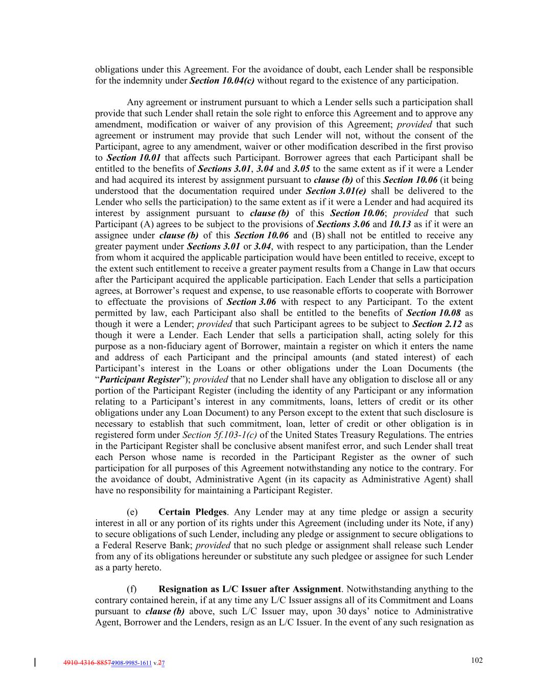 4910-4316-88574908-9985-1611 v.27 102 obligations under this Agreement. For the avoidance of doubt, each Lender shall be responsible for the indemnity under Section 10.04(c) without regard to the existence of any participation. Any agreement or instrument pursuant to which a Lender sells such a participation shall provide that such Lender shall retain the sole right to enforce this Agreement and to approve any amendment, modification or waiver of any provision of this Agreement; provided that such agreement or instrument may provide that such Lender will not, without the consent of the Participant, agree to any amendment, waiver or other modification described in the first proviso to Section 10.01 that affects such Participant. Borrower agrees that each Participant shall be entitled to the benefits of Sections 3.01, 3.04 and 3.05 to the same extent as if it were a Lender and had acquired its interest by assignment pursuant to clause (b) of this Section 10.06 (it being understood that the documentation required under Section 3.01(e) shall be delivered to the Lender who sells the participation) to the same extent as if it were a Lender and had acquired its interest by assignment pursuant to clause (b) of this Section 10.06; provided that such Participant (A) agrees to be subject to the provisions of Sections 3.06 and 10.13 as if it were an assignee under clause (b) of this Section 10.06 and (B) shall not be entitled to receive any greater payment under Sections 3.01 or 3.04, with respect to any participation, than the Lender from whom it acquired the applicable participation would have been entitled to receive, except to the extent such entitlement to receive a greater payment results from a Change in Law that occurs after the Participant acquired the applicable participation. Each Lender that sells a participation agrees, at Borrower’s request and expense, to use reasonable efforts to cooperate with Borrower to effectuate the provisions of Section 3.06 with respect to any Participant. To the extent permitted by law, each Participant also shall be entitled to the benefits of Section 10.08 as though it were a Lender; provided that such Participant agrees to be subject to Section 2.12 as though it were a Lender. Each Lender that sells a participation shall, acting solely for this purpose as a non-fiduciary agent of Borrower, maintain a register on which it enters the name and address of each Participant and the principal amounts (and stated interest) of each Participant’s interest in the Loans or other obligations under the Loan Documents (the “Participant Register”); provided that no Lender shall have any obligation to disclose all or any portion of the Participant Register (including the identity of any Participant or any information relating to a Participant’s interest in any commitments, loans, letters of credit or its other obligations under any Loan Document) to any Person except to the extent that such disclosure is necessary to establish that such commitment, loan, letter of credit or other obligation is in registered form under Section 5f.103-1(c) of the United States Treasury Regulations. The entries in the Participant Register shall be conclusive absent manifest error, and such Lender shall treat each Person whose name is recorded in the Participant Register as the owner of such participation for all purposes of this Agreement notwithstanding any notice to the contrary. For the avoidance of doubt, Administrative Agent (in its capacity as Administrative Agent) shall have no responsibility for maintaining a Participant Register. (e) Certain Pledges. Any Lender may at any time pledge or assign a security interest in all or any portion of its rights under this Agreement (including under its Note, if any) to secure obligations of such Lender, including any pledge or assignment to secure obligations to a Federal Reserve Bank; provided that no such pledge or assignment shall release such Lender from any of its obligations hereunder or substitute any such pledgee or assignee for such Lender as a party hereto. (f) Resignation as L/C Issuer after Assignment. Notwithstanding anything to the contrary contained herein, if at any time any L/C Issuer assigns all of its Commitment and Loans pursuant to clause (b) above, such L/C Issuer may, upon 30 days’ notice to Administrative Agent, Borrower and the Lenders, resign as an L/C Issuer. In the event of any such resignation as