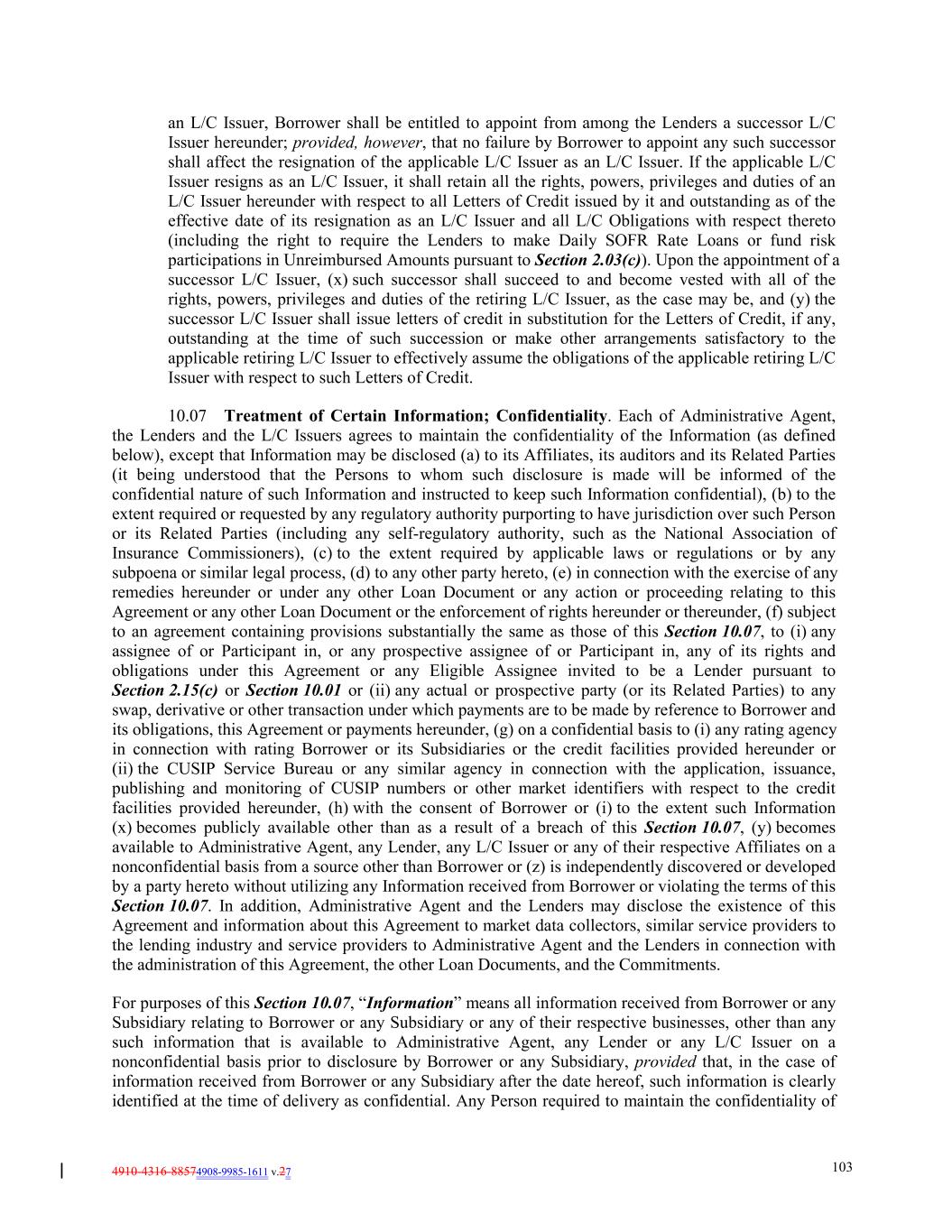 4910-4316-88574908-9985-1611 v.27 103 an L/C Issuer, Borrower shall be entitled to appoint from among the Lenders a successor L/C Issuer hereunder; provided, however, that no failure by Borrower to appoint any such successor shall affect the resignation of the applicable L/C Issuer as an L/C Issuer. If the applicable L/C Issuer resigns as an L/C Issuer, it shall retain all the rights, powers, privileges and duties of an L/C Issuer hereunder with respect to all Letters of Credit issued by it and outstanding as of the effective date of its resignation as an L/C Issuer and all L/C Obligations with respect thereto (including the right to require the Lenders to make Daily SOFR Rate Loans or fund risk participations in Unreimbursed Amounts pursuant to Section 2.03(c)). Upon the appointment of a successor L/C Issuer, (x) such successor shall succeed to and become vested with all of the rights, powers, privileges and duties of the retiring L/C Issuer, as the case may be, and (y) the successor L/C Issuer shall issue letters of credit in substitution for the Letters of Credit, if any, outstanding at the time of such succession or make other arrangements satisfactory to the applicable retiring L/C Issuer to effectively assume the obligations of the applicable retiring L/C Issuer with respect to such Letters of Credit. 10.07 Treatment of Certain Information; Confidentiality. Each of Administrative Agent, the Lenders and the L/C Issuers agrees to maintain the confidentiality of the Information (as defined below), except that Information may be disclosed (a) to its Affiliates, its auditors and its Related Parties (it being understood that the Persons to whom such disclosure is made will be informed of the confidential nature of such Information and instructed to keep such Information confidential), (b) to the extent required or requested by any regulatory authority purporting to have jurisdiction over such Person or its Related Parties (including any self-regulatory authority, such as the National Association of Insurance Commissioners), (c) to the extent required by applicable laws or regulations or by any subpoena or similar legal process, (d) to any other party hereto, (e) in connection with the exercise of any remedies hereunder or under any other Loan Document or any action or proceeding relating to this Agreement or any other Loan Document or the enforcement of rights hereunder or thereunder, (f) subject to an agreement containing provisions substantially the same as those of this Section 10.07, to (i) any assignee of or Participant in, or any prospective assignee of or Participant in, any of its rights and obligations under this Agreement or any Eligible Assignee invited to be a Lender pursuant to Section 2.15(c) or Section 10.01 or (ii) any actual or prospective party (or its Related Parties) to any swap, derivative or other transaction under which payments are to be made by reference to Borrower and its obligations, this Agreement or payments hereunder, (g) on a confidential basis to (i) any rating agency in connection with rating Borrower or its Subsidiaries or the credit facilities provided hereunder or (ii) the CUSIP Service Bureau or any similar agency in connection with the application, issuance, publishing and monitoring of CUSIP numbers or other market identifiers with respect to the credit facilities provided hereunder, (h) with the consent of Borrower or (i) to the extent such Information (x) becomes publicly available other than as a result of a breach of this Section 10.07, (y) becomes available to Administrative Agent, any Lender, any L/C Issuer or any of their respective Affiliates on a nonconfidential basis from a source other than Borrower or (z) is independently discovered or developed by a party hereto without utilizing any Information received from Borrower or violating the terms of this Section 10.07. In addition, Administrative Agent and the Lenders may disclose the existence of this Agreement and information about this Agreement to market data collectors, similar service providers to the lending industry and service providers to Administrative Agent and the Lenders in connection with the administration of this Agreement, the other Loan Documents, and the Commitments. For purposes of this Section 10.07, “Information” means all information received from Borrower or any Subsidiary relating to Borrower or any Subsidiary or any of their respective businesses, other than any such information that is available to Administrative Agent, any Lender or any L/C Issuer on a nonconfidential basis prior to disclosure by Borrower or any Subsidiary, provided that, in the case of information received from Borrower or any Subsidiary after the date hereof, such information is clearly identified at the time of delivery as confidential. Any Person required to maintain the confidentiality of