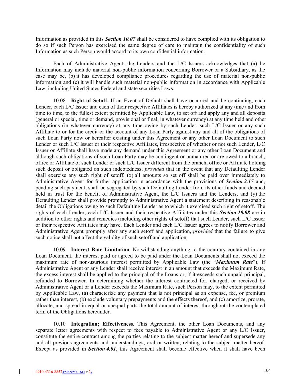 4910-4316-88574908-9985-1611 v.27 104 Information as provided in this Section 10.07 shall be considered to have complied with its obligation to do so if such Person has exercised the same degree of care to maintain the confidentiality of such Information as such Person would accord to its own confidential information. Each of Administrative Agent, the Lenders and the L/C Issuers acknowledges that (a) the Information may include material non-public information concerning Borrower or a Subsidiary, as the case may be, (b) it has developed compliance procedures regarding the use of material non-public information and (c) it will handle such material non-public information in accordance with Applicable Law, including United States Federal and state securities Laws. 10.08 Right of Setoff. If an Event of Default shall have occurred and be continuing, each Lender, each L/C Issuer and each of their respective Affiliates is hereby authorized at any time and from time to time, to the fullest extent permitted by Applicable Law, to set off and apply any and all deposits (general or special, time or demand, provisional or final, in whatever currency) at any time held and other obligations (in whatever currency) at any time owing by such Lender, such L/C Issuer or any such Affiliate to or for the credit or the account of any Loan Party against any and all of the obligations of such Loan Party now or hereafter existing under this Agreement or any other Loan Document to such Lender or such L/C Issuer or their respective Affiliates, irrespective of whether or not such Lender, L/C Issuer or Affiliate shall have made any demand under this Agreement or any other Loan Document and although such obligations of such Loan Party may be contingent or unmatured or are owed to a branch, office or Affiliate of such Lender or such L/C Issuer different from the branch, office or Affiliate holding such deposit or obligated on such indebtedness; provided that in the event that any Defaulting Lender shall exercise any such right of setoff, (x) all amounts so set off shall be paid over immediately to Administrative Agent for further application in accordance with the provisions of Section 2.17 and, pending such payment, shall be segregated by such Defaulting Lender from its other funds and deemed held in trust for the benefit of Administrative Agent, the L/C Issuers and the Lenders, and (y) the Defaulting Lender shall provide promptly to Administrative Agent a statement describing in reasonable detail the Obligations owing to such Defaulting Lender as to which it exercised such right of setoff. The rights of each Lender, each L/C Issuer and their respective Affiliates under this Section 10.08 are in addition to other rights and remedies (including other rights of setoff) that such Lender, such L/C Issuer or their respective Affiliates may have. Each Lender and each L/C Issuer agrees to notify Borrower and Administrative Agent promptly after any such setoff and application, provided that the failure to give such notice shall not affect the validity of such setoff and application. 10.09 Interest Rate Limitation. Notwithstanding anything to the contrary contained in any Loan Document, the interest paid or agreed to be paid under the Loan Documents shall not exceed the maximum rate of non-usurious interest permitted by Applicable Law (the “Maximum Rate”). If Administrative Agent or any Lender shall receive interest in an amount that exceeds the Maximum Rate, the excess interest shall be applied to the principal of the Loans or, if it exceeds such unpaid principal, refunded to Borrower. In determining whether the interest contracted for, charged, or received by Administrative Agent or a Lender exceeds the Maximum Rate, such Person may, to the extent permitted by Applicable Law, (a) characterize any payment that is not principal as an expense, fee, or premium rather than interest, (b) exclude voluntary prepayments and the effects thereof, and (c) amortize, prorate, allocate, and spread in equal or unequal parts the total amount of interest throughout the contemplated term of the Obligations hereunder. 10.10 Integration; Effectiveness. This Agreement, the other Loan Documents, and any separate letter agreements with respect to fees payable to Administrative Agent or any L/C Issuer, constitute the entire contract among the parties relating to the subject matter hereof and supersede any and all previous agreements and understandings, oral or written, relating to the subject matter hereof. Except as provided in Section 4.01, this Agreement shall become effective when it shall have been