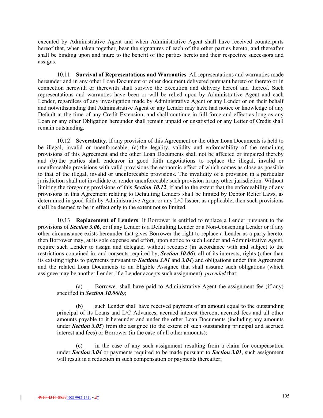 4910-4316-88574908-9985-1611 v.27 105 executed by Administrative Agent and when Administrative Agent shall have received counterparts hereof that, when taken together, bear the signatures of each of the other parties hereto, and thereafter shall be binding upon and inure to the benefit of the parties hereto and their respective successors and assigns. 10.11 Survival of Representations and Warranties. All representations and warranties made hereunder and in any other Loan Document or other document delivered pursuant hereto or thereto or in connection herewith or therewith shall survive the execution and delivery hereof and thereof. Such representations and warranties have been or will be relied upon by Administrative Agent and each Lender, regardless of any investigation made by Administrative Agent or any Lender or on their behalf and notwithstanding that Administrative Agent or any Lender may have had notice or knowledge of any Default at the time of any Credit Extension, and shall continue in full force and effect as long as any Loan or any other Obligation hereunder shall remain unpaid or unsatisfied or any Letter of Credit shall remain outstanding. 10.12 Severability. If any provision of this Agreement or the other Loan Documents is held to be illegal, invalid or unenforceable, (a) the legality, validity and enforceability of the remaining provisions of this Agreement and the other Loan Documents shall not be affected or impaired thereby and (b) the parties shall endeavor in good faith negotiations to replace the illegal, invalid or unenforceable provisions with valid provisions the economic effect of which comes as close as possible to that of the illegal, invalid or unenforceable provisions. The invalidity of a provision in a particular jurisdiction shall not invalidate or render unenforceable such provision in any other jurisdiction. Without limiting the foregoing provisions of this Section 10.12, if and to the extent that the enforceability of any provisions in this Agreement relating to Defaulting Lenders shall be limited by Debtor Relief Laws, as determined in good faith by Administrative Agent or any L/C Issuer, as applicable, then such provisions shall be deemed to be in effect only to the extent not so limited. 10.13 Replacement of Lenders. If Borrower is entitled to replace a Lender pursuant to the provisions of Section 3.06, or if any Lender is a Defaulting Lender or a Non-Consenting Lender or if any other circumstance exists hereunder that gives Borrower the right to replace a Lender as a party hereto, then Borrower may, at its sole expense and effort, upon notice to such Lender and Administrative Agent, require such Lender to assign and delegate, without recourse (in accordance with and subject to the restrictions contained in, and consents required by, Section 10.06), all of its interests, rights (other than its existing rights to payments pursuant to Sections 3.01 and 3.04) and obligations under this Agreement and the related Loan Documents to an Eligible Assignee that shall assume such obligations (which assignee may be another Lender, if a Lender accepts such assignment), provided that: (a) Borrower shall have paid to Administrative Agent the assignment fee (if any) specified in Section 10.06(b); (b) such Lender shall have received payment of an amount equal to the outstanding principal of its Loans and L/C Advances, accrued interest thereon, accrued fees and all other amounts payable to it hereunder and under the other Loan Documents (including any amounts under Section 3.05) from the assignee (to the extent of such outstanding principal and accrued interest and fees) or Borrower (in the case of all other amounts); (c) in the case of any such assignment resulting from a claim for compensation under Section 3.04 or payments required to be made pursuant to Section 3.01, such assignment will result in a reduction in such compensation or payments thereafter;