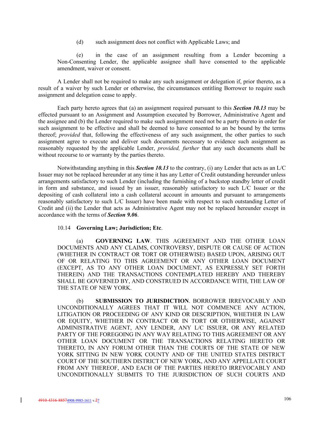 4910-4316-88574908-9985-1611 v.27 106 (d) such assignment does not conflict with Applicable Laws; and (e) in the case of an assignment resulting from a Lender becoming a Non-Consenting Lender, the applicable assignee shall have consented to the applicable amendment, waiver or consent. A Lender shall not be required to make any such assignment or delegation if, prior thereto, as a result of a waiver by such Lender or otherwise, the circumstances entitling Borrower to require such assignment and delegation cease to apply. Each party hereto agrees that (a) an assignment required pursuant to this Section 10.13 may be effected pursuant to an Assignment and Assumption executed by Borrower, Administrative Agent and the assignee and (b) the Lender required to make such assignment need not be a party thereto in order for such assignment to be effective and shall be deemed to have consented to an be bound by the terms thereof; provided that, following the effectiveness of any such assignment, the other parties to such assignment agree to execute and deliver such documents necessary to evidence such assignment as reasonably requested by the applicable Lender, provided, further that any such documents shall be without recourse to or warranty by the parties thereto. Notwithstanding anything in this Section 10.13 to the contrary, (i) any Lender that acts as an L/C Issuer may not be replaced hereunder at any time it has any Letter of Credit outstanding hereunder unless arrangements satisfactory to such Lender (including the furnishing of a backstop standby letter of credit in form and substance, and issued by an issuer, reasonably satisfactory to such L/C Issuer or the depositing of cash collateral into a cash collateral account in amounts and pursuant to arrangements reasonably satisfactory to such L/C Issuer) have been made with respect to such outstanding Letter of Credit and (ii) the Lender that acts as Administrative Agent may not be replaced hereunder except in accordance with the terms of Section 9.06. 10.14 Governing Law; Jurisdiction; Etc. (a) GOVERNING LAW. THIS AGREEMENT AND THE OTHER LOAN DOCUMENTS AND ANY CLAIMS, CONTROVERSY, DISPUTE OR CAUSE OF ACTION (WHETHER IN CONTRACT OR TORT OR OTHERWISE) BASED UPON, ARISING OUT OF OR RELATING TO THIS AGREEMENT OR ANY OTHER LOAN DOCUMENT (EXCEPT, AS TO ANY OTHER LOAN DOCUMENT, AS EXPRESSLY SET FORTH THEREIN) AND THE TRANSACTIONS CONTEMPLATED HEREBY AND THEREBY SHALL BE GOVERNED BY, AND CONSTRUED IN ACCORDANCE WITH, THE LAW OF THE STATE OF NEW YORK. (b) SUBMISSION TO JURISDICTION. BORROWER IRREVOCABLY AND UNCONDITIONALLY AGREES THAT IT WILL NOT COMMENCE ANY ACTION, LITIGATION OR PROCEEDING OF ANY KIND OR DESCRIPTION, WHETHER IN LAW OR EQUITY, WHETHER IN CONTRACT OR IN TORT OR OTHERWISE, AGAINST ADMINISTRATIVE AGENT, ANY LENDER, ANY L/C ISSUER, OR ANY RELATED PARTY OF THE FOREGOING IN ANY WAY RELATING TO THIS AGREEMENT OR ANY OTHER LOAN DOCUMENT OR THE TRANSACTIONS RELATING HERETO OR THERETO, IN ANY FORUM OTHER THAN THE COURTS OF THE STATE OF NEW YORK SITTING IN NEW YORK COUNTY AND OF THE UNITED STATES DISTRICT COURT OF THE SOUTHERN DISTRICT OF NEW YORK, AND ANY APPELLATE COURT FROM ANY THEREOF, AND EACH OF THE PARTIES HERETO IRREVOCABLY AND UNCONDITIONALLY SUBMITS TO THE JURISDICTION OF SUCH COURTS AND