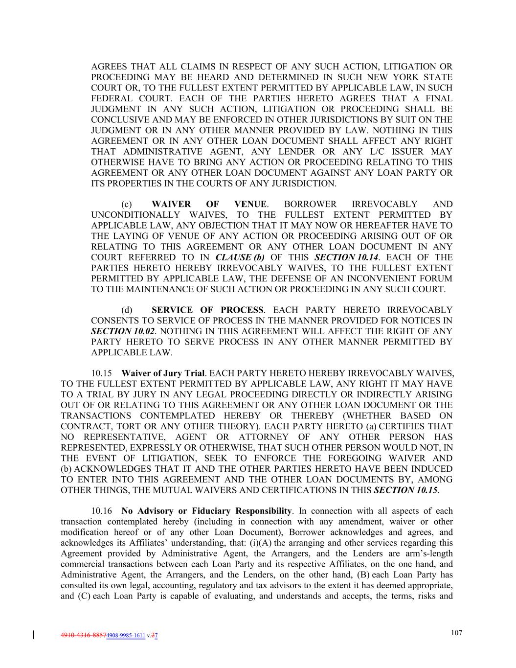 4910-4316-88574908-9985-1611 v.27 107 AGREES THAT ALL CLAIMS IN RESPECT OF ANY SUCH ACTION, LITIGATION OR PROCEEDING MAY BE HEARD AND DETERMINED IN SUCH NEW YORK STATE COURT OR, TO THE FULLEST EXTENT PERMITTED BY APPLICABLE LAW, IN SUCH FEDERAL COURT. EACH OF THE PARTIES HERETO AGREES THAT A FINAL JUDGMENT IN ANY SUCH ACTION, LITIGATION OR PROCEEDING SHALL BE CONCLUSIVE AND MAY BE ENFORCED IN OTHER JURISDICTIONS BY SUIT ON THE JUDGMENT OR IN ANY OTHER MANNER PROVIDED BY LAW. NOTHING IN THIS AGREEMENT OR IN ANY OTHER LOAN DOCUMENT SHALL AFFECT ANY RIGHT THAT ADMINISTRATIVE AGENT, ANY LENDER OR ANY L/C ISSUER MAY OTHERWISE HAVE TO BRING ANY ACTION OR PROCEEDING RELATING TO THIS AGREEMENT OR ANY OTHER LOAN DOCUMENT AGAINST ANY LOAN PARTY OR ITS PROPERTIES IN THE COURTS OF ANY JURISDICTION. (c) WAIVER OF VENUE. BORROWER IRREVOCABLY AND UNCONDITIONALLY WAIVES, TO THE FULLEST EXTENT PERMITTED BY APPLICABLE LAW, ANY OBJECTION THAT IT MAY NOW OR HEREAFTER HAVE TO THE LAYING OF VENUE OF ANY ACTION OR PROCEEDING ARISING OUT OF OR RELATING TO THIS AGREEMENT OR ANY OTHER LOAN DOCUMENT IN ANY COURT REFERRED TO IN CLAUSE (b) OF THIS SECTION 10.14. EACH OF THE PARTIES HERETO HEREBY IRREVOCABLY WAIVES, TO THE FULLEST EXTENT PERMITTED BY APPLICABLE LAW, THE DEFENSE OF AN INCONVENIENT FORUM TO THE MAINTENANCE OF SUCH ACTION OR PROCEEDING IN ANY SUCH COURT. (d) SERVICE OF PROCESS. EACH PARTY HERETO IRREVOCABLY CONSENTS TO SERVICE OF PROCESS IN THE MANNER PROVIDED FOR NOTICES IN SECTION 10.02. NOTHING IN THIS AGREEMENT WILL AFFECT THE RIGHT OF ANY PARTY HERETO TO SERVE PROCESS IN ANY OTHER MANNER PERMITTED BY APPLICABLE LAW. 10.15 Waiver of Jury Trial. EACH PARTY HERETO HEREBY IRREVOCABLY WAIVES, TO THE FULLEST EXTENT PERMITTED BY APPLICABLE LAW, ANY RIGHT IT MAY HAVE TO A TRIAL BY JURY IN ANY LEGAL PROCEEDING DIRECTLY OR INDIRECTLY ARISING OUT OF OR RELATING TO THIS AGREEMENT OR ANY OTHER LOAN DOCUMENT OR THE TRANSACTIONS CONTEMPLATED HEREBY OR THEREBY (WHETHER BASED ON CONTRACT, TORT OR ANY OTHER THEORY). EACH PARTY HERETO (a) CERTIFIES THAT NO REPRESENTATIVE, AGENT OR ATTORNEY OF ANY OTHER PERSON HAS REPRESENTED, EXPRESSLY OR OTHERWISE, THAT SUCH OTHER PERSON WOULD NOT, IN THE EVENT OF LITIGATION, SEEK TO ENFORCE THE FOREGOING WAIVER AND (b) ACKNOWLEDGES THAT IT AND THE OTHER PARTIES HERETO HAVE BEEN INDUCED TO ENTER INTO THIS AGREEMENT AND THE OTHER LOAN DOCUMENTS BY, AMONG OTHER THINGS, THE MUTUAL WAIVERS AND CERTIFICATIONS IN THIS SECTION 10.15. 10.16 No Advisory or Fiduciary Responsibility. In connection with all aspects of each transaction contemplated hereby (including in connection with any amendment, waiver or other modification hereof or of any other Loan Document), Borrower acknowledges and agrees, and acknowledges its Affiliates’ understanding, that: (i)(A) the arranging and other services regarding this Agreement provided by Administrative Agent, the Arrangers, and the Lenders are arm’s-length commercial transactions between each Loan Party and its respective Affiliates, on the one hand, and Administrative Agent, the Arrangers, and the Lenders, on the other hand, (B) each Loan Party has consulted its own legal, accounting, regulatory and tax advisors to the extent it has deemed appropriate, and (C) each Loan Party is capable of evaluating, and understands and accepts, the terms, risks and