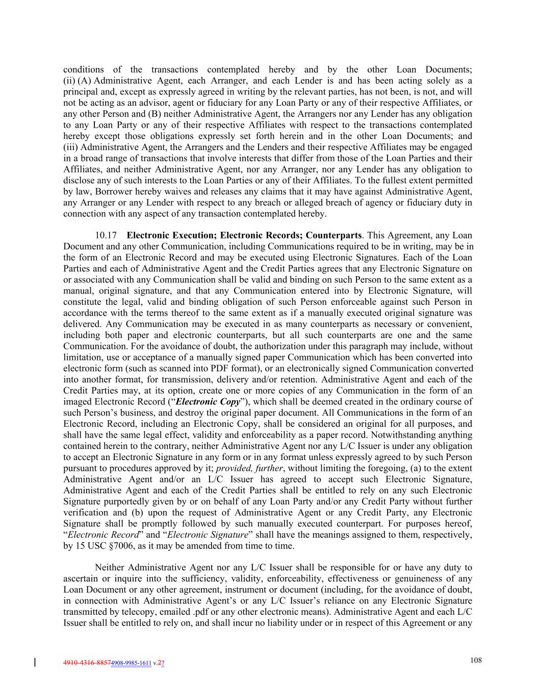 4910-4316-88574908-9985-1611 v.27 108 conditions of the transactions contemplated hereby and by the other Loan Documents; (ii) (A) Administrative Agent, each Arranger, and each Lender is and has been acting solely as a principal and, except as expressly agreed in writing by the relevant parties, has not been, is not, and will not be acting as an advisor, agent or fiduciary for any Loan Party or any of their respective Affiliates, or any other Person and (B) neither Administrative Agent, the Arrangers nor any Lender has any obligation to any Loan Party or any of their respective Affiliates with respect to the transactions contemplated hereby except those obligations expressly set forth herein and in the other Loan Documents; and (iii) Administrative Agent, the Arrangers and the Lenders and their respective Affiliates may be engaged in a broad range of transactions that involve interests that differ from those of the Loan Parties and their Affiliates, and neither Administrative Agent, nor any Arranger, nor any Lender has any obligation to disclose any of such interests to the Loan Parties or any of their Affiliates. To the fullest extent permitted by law, Borrower hereby waives and releases any claims that it may have against Administrative Agent, any Arranger or any Lender with respect to any breach or alleged breach of agency or fiduciary duty in connection with any aspect of any transaction contemplated hereby. 10.17 Electronic Execution; Electronic Records; Counterparts. This Agreement, any Loan Document and any other Communication, including Communications required to be in writing, may be in the form of an Electronic Record and may be executed using Electronic Signatures. Each of the Loan Parties and each of Administrative Agent and the Credit Parties agrees that any Electronic Signature on or associated with any Communication shall be valid and binding on such Person to the same extent as a manual, original signature, and that any Communication entered into by Electronic Signature, will constitute the legal, valid and binding obligation of such Person enforceable against such Person in accordance with the terms thereof to the same extent as if a manually executed original signature was delivered. Any Communication may be executed in as many counterparts as necessary or convenient, including both paper and electronic counterparts, but all such counterparts are one and the same Communication. For the avoidance of doubt, the authorization under this paragraph may include, without limitation, use or acceptance of a manually signed paper Communication which has been converted into electronic form (such as scanned into PDF format), or an electronically signed Communication converted into another format, for transmission, delivery and/or retention. Administrative Agent and each of the Credit Parties may, at its option, create one or more copies of any Communication in the form of an imaged Electronic Record (“Electronic Copy”), which shall be deemed created in the ordinary course of such Person’s business, and destroy the original paper document. All Communications in the form of an Electronic Record, including an Electronic Copy, shall be considered an original for all purposes, and shall have the same legal effect, validity and enforceability as a paper record. Notwithstanding anything contained herein to the contrary, neither Administrative Agent nor any L/C Issuer is under any obligation to accept an Electronic Signature in any form or in any format unless expressly agreed to by such Person pursuant to procedures approved by it; provided, further, without limiting the foregoing, (a) to the extent Administrative Agent and/or an L/C Issuer has agreed to accept such Electronic Signature, Administrative Agent and each of the Credit Parties shall be entitled to rely on any such Electronic Signature purportedly given by or on behalf of any Loan Party and/or any Credit Party without further verification and (b) upon the request of Administrative Agent or any Credit Party, any Electronic Signature shall be promptly followed by such manually executed counterpart. For purposes hereof, “Electronic Record” and “Electronic Signature” shall have the meanings assigned to them, respectively, by 15 USC §7006, as it may be amended from time to time. Neither Administrative Agent nor any L/C Issuer shall be responsible for or have any duty to ascertain or inquire into the sufficiency, validity, enforceability, effectiveness or genuineness of any Loan Document or any other agreement, instrument or document (including, for the avoidance of doubt, in connection with Administrative Agent’s or any L/C Issuer’s reliance on any Electronic Signature transmitted by telecopy, emailed .pdf or any other electronic means). Administrative Agent and each L/C Issuer shall be entitled to rely on, and shall incur no liability under or in respect of this Agreement or any