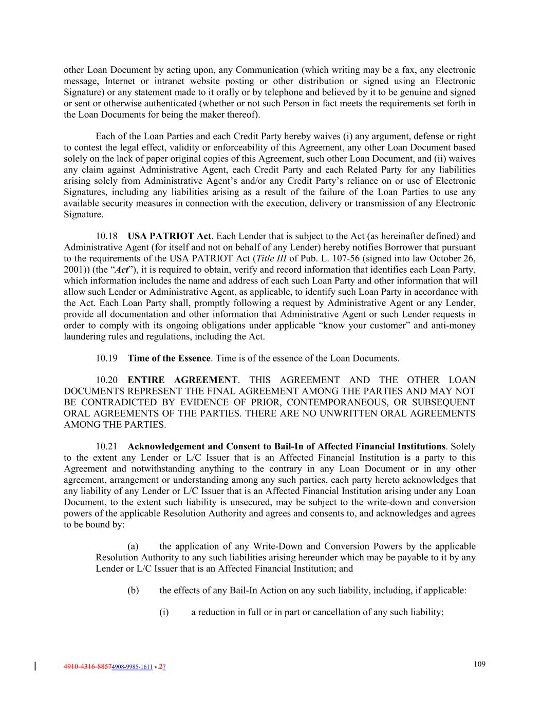 4910-4316-88574908-9985-1611 v.27 109 other Loan Document by acting upon, any Communication (which writing may be a fax, any electronic message, Internet or intranet website posting or other distribution or signed using an Electronic Signature) or any statement made to it orally or by telephone and believed by it to be genuine and signed or sent or otherwise authenticated (whether or not such Person in fact meets the requirements set forth in the Loan Documents for being the maker thereof). Each of the Loan Parties and each Credit Party hereby waives (i) any argument, defense or right to contest the legal effect, validity or enforceability of this Agreement, any other Loan Document based solely on the lack of paper original copies of this Agreement, such other Loan Document, and (ii) waives any claim against Administrative Agent, each Credit Party and each Related Party for any liabilities arising solely from Administrative Agent’s and/or any Credit Party’s reliance on or use of Electronic Signatures, including any liabilities arising as a result of the failure of the Loan Parties to use any available security measures in connection with the execution, delivery or transmission of any Electronic Signature. 10.18 USA PATRIOT Act. Each Lender that is subject to the Act (as hereinafter defined) and Administrative Agent (for itself and not on behalf of any Lender) hereby notifies Borrower that pursuant to the requirements of the USA PATRIOT Act (Title III of Pub. L. 107-56 (signed into law October 26, 2001)) (the “Act”), it is required to obtain, verify and record information that identifies each Loan Party, which information includes the name and address of each such Loan Party and other information that will allow such Lender or Administrative Agent, as applicable, to identify such Loan Party in accordance with the Act. Each Loan Party shall, promptly following a request by Administrative Agent or any Lender, provide all documentation and other information that Administrative Agent or such Lender requests in order to comply with its ongoing obligations under applicable “know your customer” and anti-money laundering rules and regulations, including the Act. 10.19 Time of the Essence. Time is of the essence of the Loan Documents. 10.20 ENTIRE AGREEMENT. THIS AGREEMENT AND THE OTHER LOAN DOCUMENTS REPRESENT THE FINAL AGREEMENT AMONG THE PARTIES AND MAY NOT BE CONTRADICTED BY EVIDENCE OF PRIOR, CONTEMPORANEOUS, OR SUBSEQUENT ORAL AGREEMENTS OF THE PARTIES. THERE ARE NO UNWRITTEN ORAL AGREEMENTS AMONG THE PARTIES. 10.21 Acknowledgement and Consent to Bail-In of Affected Financial Institutions. Solely to the extent any Lender or L/C Issuer that is an Affected Financial Institution is a party to this Agreement and notwithstanding anything to the contrary in any Loan Document or in any other agreement, arrangement or understanding among any such parties, each party hereto acknowledges that any liability of any Lender or L/C Issuer that is an Affected Financial Institution arising under any Loan Document, to the extent such liability is unsecured, may be subject to the write-down and conversion powers of the applicable Resolution Authority and agrees and consents to, and acknowledges and agrees to be bound by: (a) the application of any Write-Down and Conversion Powers by the applicable Resolution Authority to any such liabilities arising hereunder which may be payable to it by any Lender or L/C Issuer that is an Affected Financial Institution; and (b) the effects of any Bail-In Action on any such liability, including, if applicable: (i) a reduction in full or in part or cancellation of any such liability;