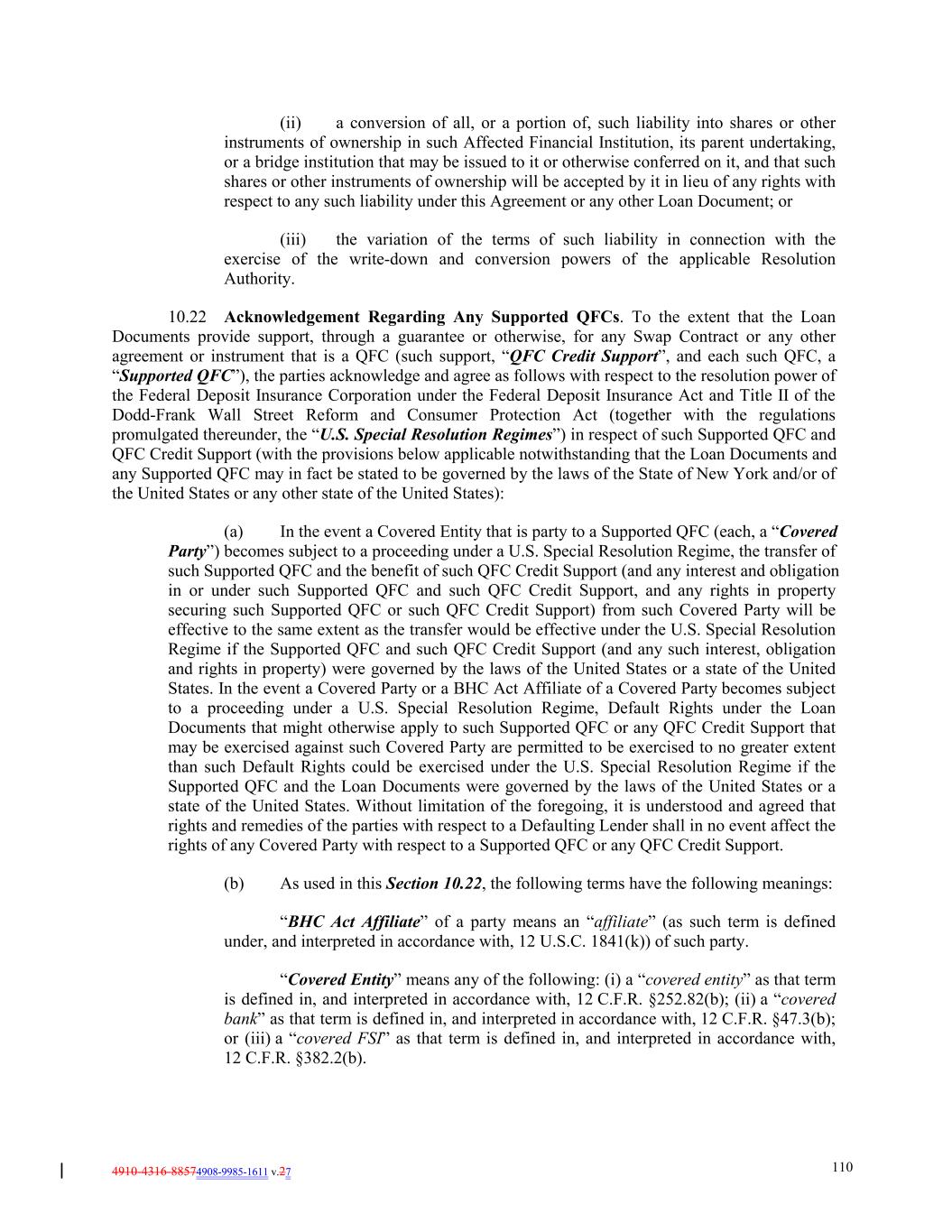 4910-4316-88574908-9985-1611 v.27 110 (ii) a conversion of all, or a portion of, such liability into shares or other instruments of ownership in such Affected Financial Institution, its parent undertaking, or a bridge institution that may be issued to it or otherwise conferred on it, and that such shares or other instruments of ownership will be accepted by it in lieu of any rights with respect to any such liability under this Agreement or any other Loan Document; or (iii) the variation of the terms of such liability in connection with the exercise of the write-down and conversion powers of the applicable Resolution Authority. 10.22 Acknowledgement Regarding Any Supported QFCs. To the extent that the Loan Documents provide support, through a guarantee or otherwise, for any Swap Contract or any other agreement or instrument that is a QFC (such support, “QFC Credit Support”, and each such QFC, a “Supported QFC”), the parties acknowledge and agree as follows with respect to the resolution power of the Federal Deposit Insurance Corporation under the Federal Deposit Insurance Act and Title II of the Dodd-Frank Wall Street Reform and Consumer Protection Act (together with the regulations promulgated thereunder, the “U.S. Special Resolution Regimes”) in respect of such Supported QFC and QFC Credit Support (with the provisions below applicable notwithstanding that the Loan Documents and any Supported QFC may in fact be stated to be governed by the laws of the State of New York and/or of the United States or any other state of the United States): (a) In the event a Covered Entity that is party to a Supported QFC (each, a “Covered Party”) becomes subject to a proceeding under a U.S. Special Resolution Regime, the transfer of such Supported QFC and the benefit of such QFC Credit Support (and any interest and obligation in or under such Supported QFC and such QFC Credit Support, and any rights in property securing such Supported QFC or such QFC Credit Support) from such Covered Party will be effective to the same extent as the transfer would be effective under the U.S. Special Resolution Regime if the Supported QFC and such QFC Credit Support (and any such interest, obligation and rights in property) were governed by the laws of the United States or a state of the United States. In the event a Covered Party or a BHC Act Affiliate of a Covered Party becomes subject to a proceeding under a U.S. Special Resolution Regime, Default Rights under the Loan Documents that might otherwise apply to such Supported QFC or any QFC Credit Support that may be exercised against such Covered Party are permitted to be exercised to no greater extent than such Default Rights could be exercised under the U.S. Special Resolution Regime if the Supported QFC and the Loan Documents were governed by the laws of the United States or a state of the United States. Without limitation of the foregoing, it is understood and agreed that rights and remedies of the parties with respect to a Defaulting Lender shall in no event affect the rights of any Covered Party with respect to a Supported QFC or any QFC Credit Support. (b) As used in this Section 10.22, the following terms have the following meanings: “BHC Act Affiliate” of a party means an “affiliate” (as such term is defined under, and interpreted in accordance with, 12 U.S.C. 1841(k)) of such party. “Covered Entity” means any of the following: (i) a “covered entity” as that term is defined in, and interpreted in accordance with, 12 C.F.R. §252.82(b); (ii) a “covered bank” as that term is defined in, and interpreted in accordance with, 12 C.F.R. §47.3(b); or (iii) a “covered FSI” as that term is defined in, and interpreted in accordance with, 12 C.F.R. §382.2(b).
