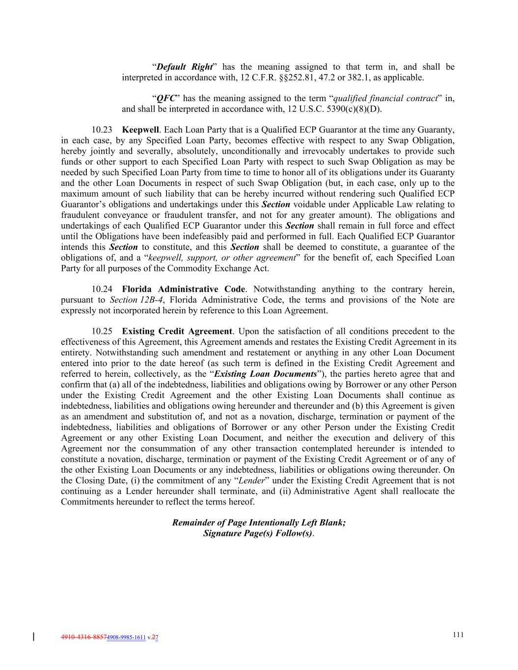 4910-4316-88574908-9985-1611 v.27 111 “Default Right” has the meaning assigned to that term in, and shall be interpreted in accordance with, 12 C.F.R. §§252.81, 47.2 or 382.1, as applicable. “QFC” has the meaning assigned to the term “qualified financial contract” in, and shall be interpreted in accordance with, 12 U.S.C. 5390(c)(8)(D). 10.23 Keepwell. Each Loan Party that is a Qualified ECP Guarantor at the time any Guaranty, in each case, by any Specified Loan Party, becomes effective with respect to any Swap Obligation, hereby jointly and severally, absolutely, unconditionally and irrevocably undertakes to provide such funds or other support to each Specified Loan Party with respect to such Swap Obligation as may be needed by such Specified Loan Party from time to time to honor all of its obligations under its Guaranty and the other Loan Documents in respect of such Swap Obligation (but, in each case, only up to the maximum amount of such liability that can be hereby incurred without rendering such Qualified ECP Guarantor’s obligations and undertakings under this Section voidable under Applicable Law relating to fraudulent conveyance or fraudulent transfer, and not for any greater amount). The obligations and undertakings of each Qualified ECP Guarantor under this Section shall remain in full force and effect until the Obligations have been indefeasibly paid and performed in full. Each Qualified ECP Guarantor intends this Section to constitute, and this Section shall be deemed to constitute, a guarantee of the obligations of, and a “keepwell, support, or other agreement” for the benefit of, each Specified Loan Party for all purposes of the Commodity Exchange Act. 10.24 Florida Administrative Code. Notwithstanding anything to the contrary herein, pursuant to Section 12B-4, Florida Administrative Code, the terms and provisions of the Note are expressly not incorporated herein by reference to this Loan Agreement. 10.25 Existing Credit Agreement. Upon the satisfaction of all conditions precedent to the effectiveness of this Agreement, this Agreement amends and restates the Existing Credit Agreement in its entirety. Notwithstanding such amendment and restatement or anything in any other Loan Document entered into prior to the date hereof (as such term is defined in the Existing Credit Agreement and referred to herein, collectively, as the “Existing Loan Documents”), the parties hereto agree that and confirm that (a) all of the indebtedness, liabilities and obligations owing by Borrower or any other Person under the Existing Credit Agreement and the other Existing Loan Documents shall continue as indebtedness, liabilities and obligations owing hereunder and thereunder and (b) this Agreement is given as an amendment and substitution of, and not as a novation, discharge, termination or payment of the indebtedness, liabilities and obligations of Borrower or any other Person under the Existing Credit Agreement or any other Existing Loan Document, and neither the execution and delivery of this Agreement nor the consummation of any other transaction contemplated hereunder is intended to constitute a novation, discharge, termination or payment of the Existing Credit Agreement or of any of the other Existing Loan Documents or any indebtedness, liabilities or obligations owing thereunder. On the Closing Date, (i) the commitment of any “Lender” under the Existing Credit Agreement that is not continuing as a Lender hereunder shall terminate, and (ii) Administrative Agent shall reallocate the Commitments hereunder to reflect the terms hereof. Remainder of Page Intentionally Left Blank; Signature Page(s) Follow(s).