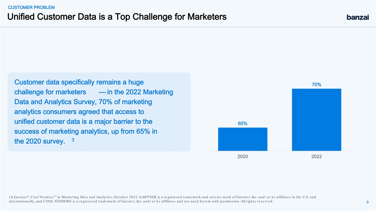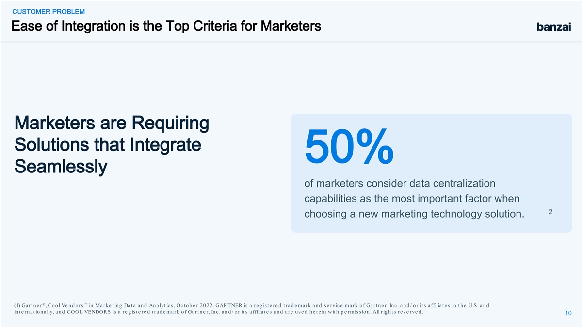 CUSTOMER PROBLEM Unified Customer Data is a Top Challenge for Marketers Customer data specifically remains a huge 70% challenge for marketers — in the 2022 Marketing Data and Analytics Survey, 70% of marketing analytics consumers agreed that access to unified customer data is a major barrier to the 65% success of marketing analytics, up from 65% in 3 the 2020 survey. 2020 2022 ® ™ (1) Gart ne r , Cool Ve nd ors in Marke t ing Dat a and Analyt ics , Oct ob e r 20 22. GARTNER is a re g is t e re d t rad e mark and s e rvice mark of Gart ne r, Inc. and / or it s a ffilia t e s in t h e U.S. a n d int e rnat ionally, and COOL VENDORS is a re g is t e re d t rad e mark of Gart ne r, Inc. and / or it s affiliat e s and are us e d h e re in wit h p e rmis s io n . All rig h t s re s e rve d . 9