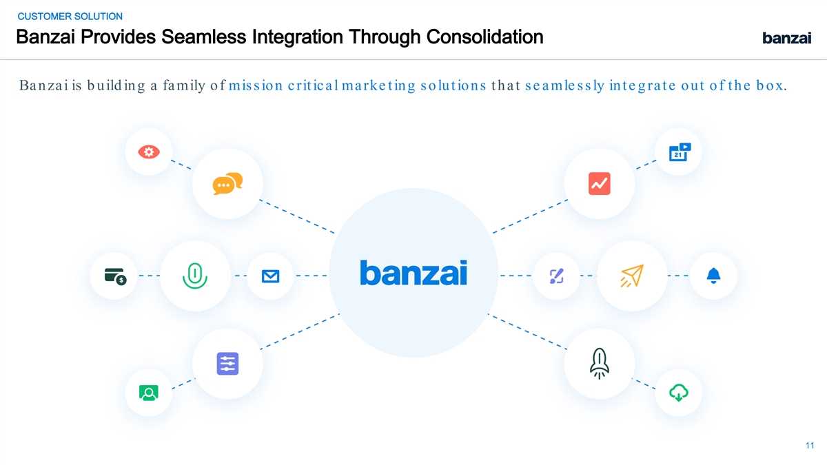 CUSTOMER SOLUTION Banzai Provides Seamless Integration Through Consolidation Ba n za i is b uild in g a fa mily o f mis s io n c rit ic a l ma rke t in g s o lut io n s t h at s e a mle s s ly int e g ra t e ou t of t h e b ox. 11