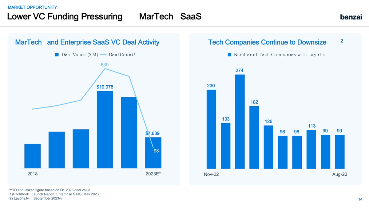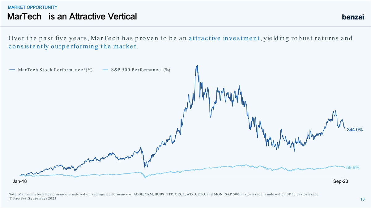 MARKET OPPORTUNITY MarTech is an Attractive Vertical Over t h e p a s t five yea rs , MarTe ch h a s p rove n t o b e a n a t t ra c t ive in ve s tme n t , yie ld ing rob us t re t urns a nd c ons is t e n t ly out p e rforming t h e ma rke t . 1 1 MarTe ch St oc k P e rforma nc e (%) S &P 50 0 P e rfo rma n c e (%) 344.0% 59.9% Jan-18 Sep-23 Not e : MarTe ch St ock P e rformance is ind e xe d on ave rag e p e rformance of ADBE, CRM, HUBS, TTD, ORCL, WIX, CRTO, and MGNI; S&P 50 0 P e rformance is ind e xe d on SP 50 p e rformance (1) Fa c t S et , S ep t emb er 20 23 13