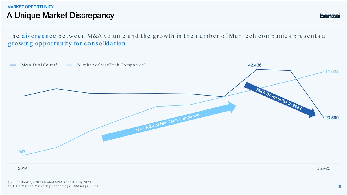 MARKET OPPORTUNITY Lower VC Funding Pressuring MarTech SaaS 2 MarTech and Enterprise SaaS VC Deal Activity Tech Companies Continue to Downsize 1 1 De a l Va lue ($ M) De a l Count Numb e r of Te c h Comp a nie s wit h La yoffs 639 274 230 $19,078 182 133 126 113 99 99 96 96 $7,639 93 2018 2023E* Nov-22 Aug-23 *YTD annualized figure based on Q1 2023 deal value (1) PitchBook Launch Report: Enterprise SaaS, May 2023 (2) Layoffs.fyi , September 2023vv 14