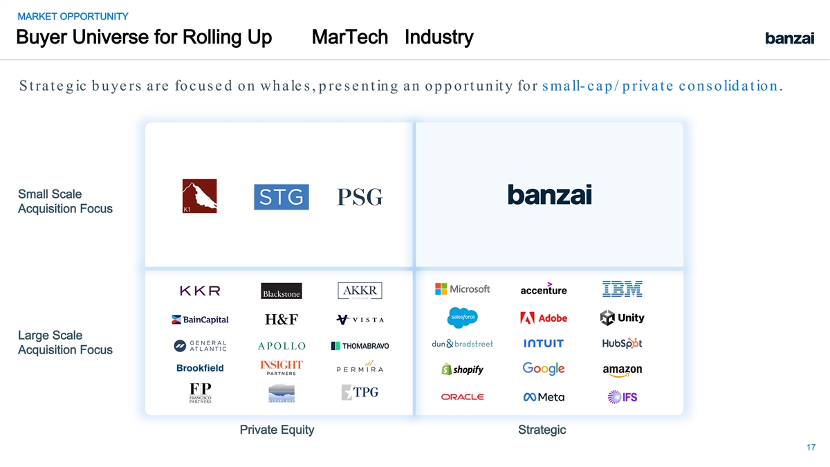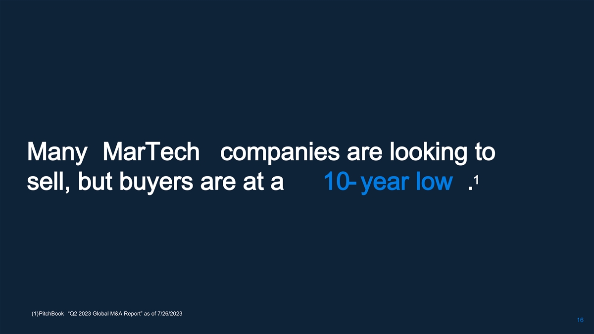 Many MarTech companies are looking to 1 sell, but buyers are at a 10- year low . (1) PitchBook “Q2 2023 Global M&A Report” as of 7/26/2023 16