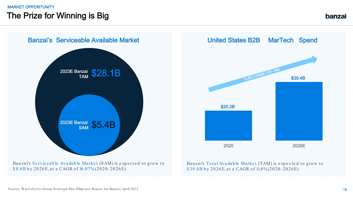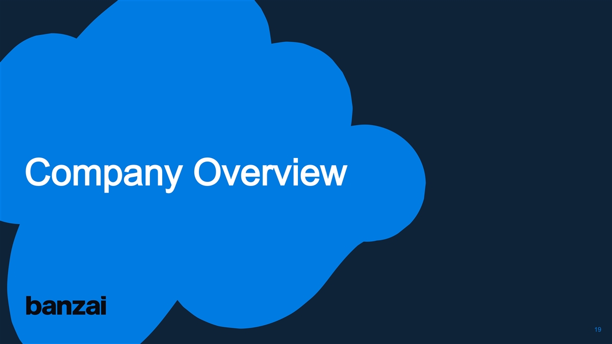 MARKET OPPORTUNITY The Prize for Winning is Big Banzai’s Serviceable Available Market United States B2B MarTech Spend 2023E Banzai $28.1B TAM $39.4B $20.2B 2023E Banzai $5.4B SAM 2020 2026E Ban zai’s Se rvice ab le Availab le Marke t (SAM) is e xp e c t e d t o g row t o Banzai’s Tot al Availab le Marke t (TAM) is e xp e ct e d t o g row t o $ 8.4 B b y 20 26E, a t a CAGR o f 16.0 7% (20 20 - 20 26E) $ 39.4 B b y 20 26 E, a t a CAGR o f 11.8% (20 20 - 20 26E) So urc e : Wint e rb e rry Group St ra t e g ic Due Dilig e nc e Re p o rt fo r Ba n za i, Ap ril 20 23 18