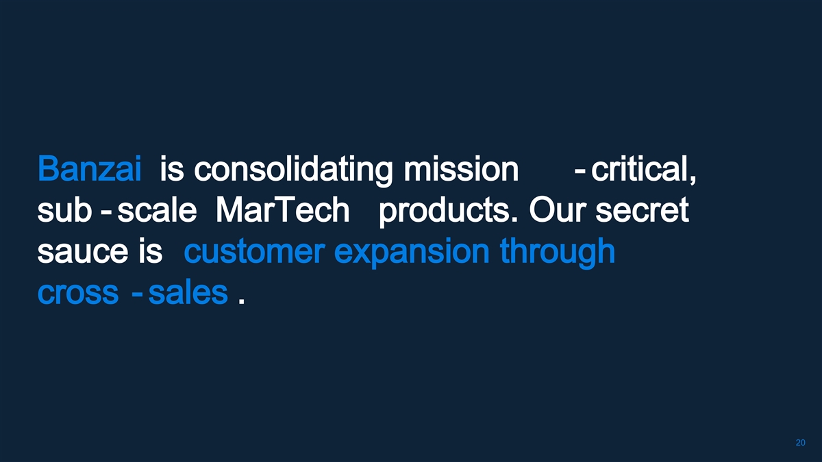 Banzai is consolidating mission - critical, sub - scale MarTech products. Our secret sauce is customer expansion through cross - sales . 20
