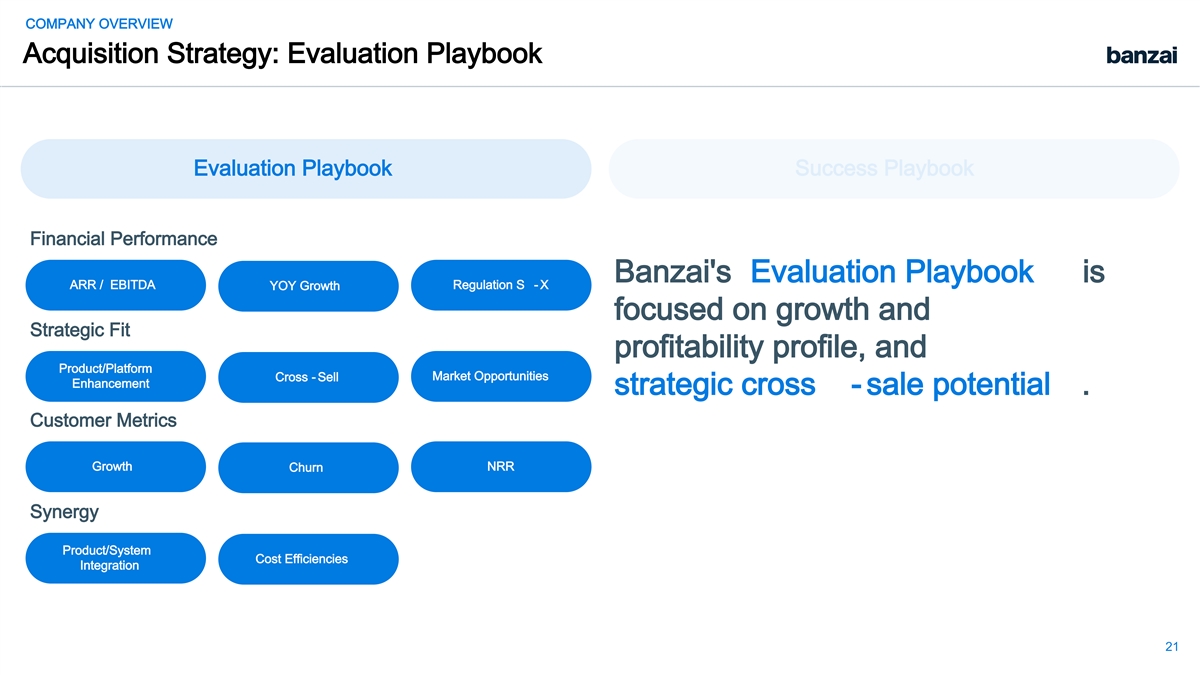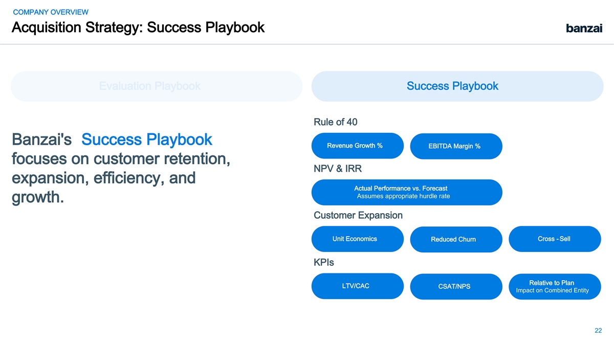 COMPANY OVERVIEW Acquisition Strategy: Evaluation Playbook Evaluation Playbook Success Playbook Financial Performance Banzai's Evaluation Playbook is ARR / EBITDA Regulation S - X YOY Growth focused on growth and Strategic Fit profitability profile, and Product/Platform Market Opportunities Cross - Sell Enhancement strategic cross - sale potential . Customer Metrics Growth NRR Churn Synergy Product/System Cost Efficiencies Integration 21