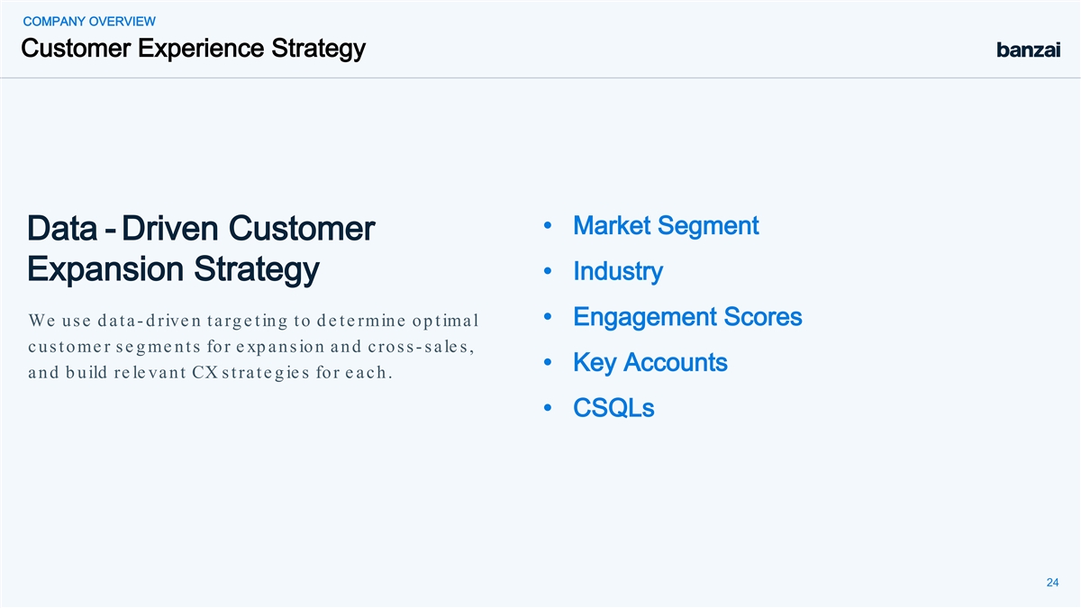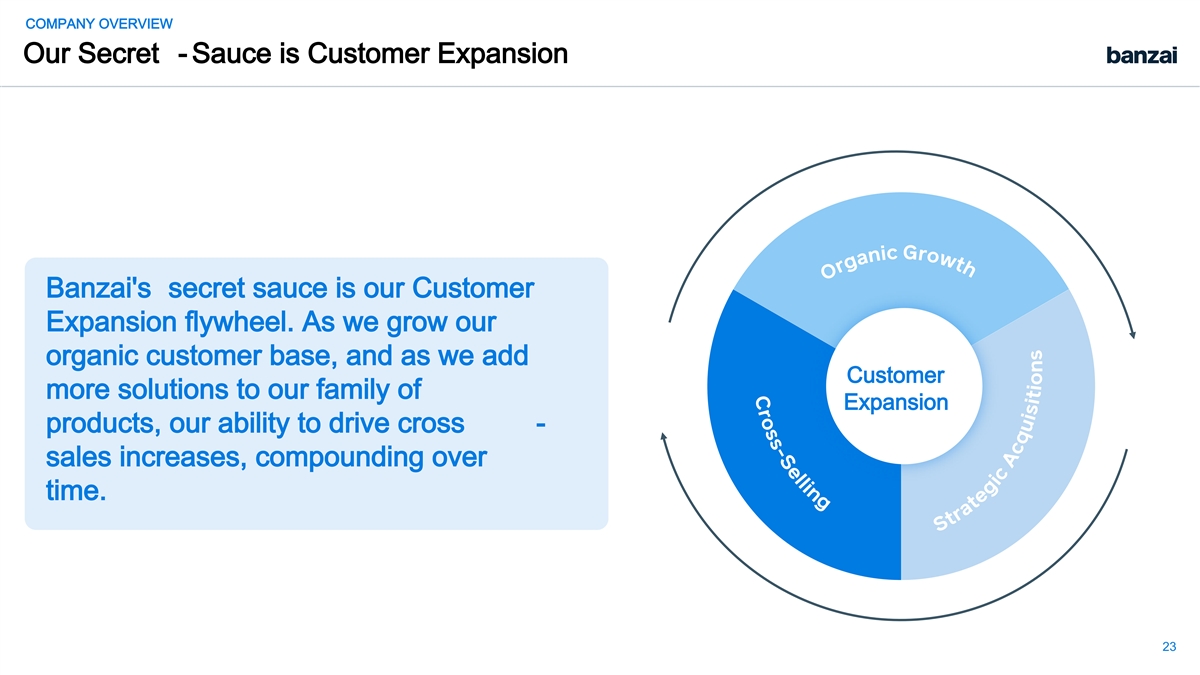 COMPANY OVERVIEW Our Secret - Sauce is Customer Expansion Banzai's secret sauce is our Customer Expansion flywheel. As we grow our organic customer base, and as we add Customer more solutions to our family of Expansion products, our ability to drive cross - sales increases, compounding over time. 23