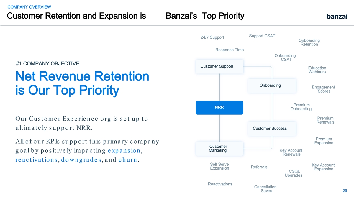COMPANY OVERVIEW Customer Retention and Expansion is Banzai’s Top Priority Support CSAT 24/7 Support Onboarding Retention Response Time Onboarding CSAT #1 COMPANY OBJECTIVE Customer Support Education Webinars Net Revenue Retention Onboarding Engagement Scores is Our Top Priority Premium NRR Onboarding Premium Our Cus t ome r Exp e rie nce org is s e t up t o Renewals ult ima t e ly s up p o rt NRR. Customer Success Premium All of our KP Is s up p ort t h is p rima ry comp a ny Expansion Customer Marketing Key Account g o a l b y p o s it ive ly imp a c t in g e xp a ns ion, Renewals re a ct iva t ions , d owng ra d e s , a n d ch urn. Self Serve Key Account Referrals Expansion Expansion CSQL Upgrades Reactivations Cancellation 25 Saves