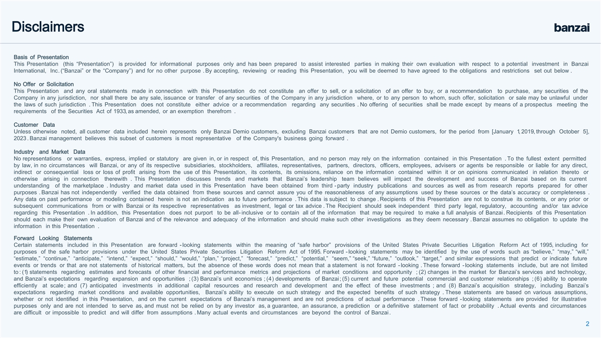 Disclaimers Basis of Presentation This Presentation (this “Presentation”) is provided for informational purposes only and has been prepared to assist interested parties in making their own evaluation with respect to a potential investment in Banzai International, Inc. (“Banzai” or the “Company”) and for no other purpose . By accepting, reviewing or reading this Presentation, you will be deemed to have agreed to the obligations and restrictions set out below . No Offer or Solicitation This Presentation and any oral statements made in connection with this Presentation do not constitute an offer to sell, or a solicitation of an offer to buy, or a recommendation to purchase, any securities of the Company in any jurisdiction, nor shall there be any sale, issuance or transfer of any securities of the Company in any jurisdiction where, or to any person to whom, such offer, solicitation or sale may be unlawful under the laws of such jurisdiction . This Presentation does not constitute either advice or a recommendation regarding any securities . No offering of securities shall be made except by means of a prospectus meeting the requirements of the Securities Act of 1933, as amended, or an exemption therefrom . Customer Data Unless otherwise noted, all customer data included herein represents only Banzai Demio customers, excluding Banzai customers that are not Demio customers, for the period from [January 1, 2019, through October 5], 2023 . Banzai management believes this subset of customers is most representative of the Company's business going forward . Industry and Market Data No representations or warranties, express, implied or statutory are given in, or in respect of, this Presentation, and no person may rely on the information contained in this Presentation . To the fullest extent permitted by law, in no circumstances will Banzai, or any of its respective subsidiaries, stockholders, affiliates, representatives, partners, directors, officers, employees, advisers or agents be responsible or liable for any direct, indirect or consequential loss or loss of profit arising from the use of this Presentation, its contents, its omissions, reliance on the information contained within it or on opinions communicated in relation thereto or otherwise arising in connection therewith . This Presentation discusses trends and markets that Banzai’s leadership team believes will impact the development and success of Banzai based on its current understanding of the marketplace . Industry and market data used in this Presentation have been obtained from third - party industry publications and sources as well as from research reports prepared for other purposes . Banzai has not independently verified the data obtained from these sources and cannot assure you of the reasonableness of any assumptions used by these sources or the data’s accuracy or completeness . Any data on past performance or modeling contained herein is not an indication as to future performance . This data is subject to change . Recipients of this Presentation are not to construe its contents, or any prior or subsequent communications from or with Banzai or its respective representatives as investment, legal or tax advice . The Recipient should seek independent third party legal, regulatory, accounting and/or tax advice regarding this Presentation . In addition, this Presentation does not purport to be all- inclusive or to contain all of the information that may be required to make a full analysis of Banzai. Recipients of this Presentation should each make their own evaluation of Banzai and of the relevance and adequacy of the information and should make such other investigations as they deem necessary . Banzai assumes no obligation to update the information in this Presentation . Forward Looking Statements Certain statements included in this Presentation are forward - looking statements within the meaning of “safe harbor” provisions of the United States Private Securities Litigation Reform Act of 1995, including for purposes of the safe harbor provisions under the United States Private Securities Litigation Reform Act of 1995. Forward - looking statements may be identified by the use of words such as “believe,” “may,” “will,” “estimate,” “continue,” “anticipate,” “intend,” “expect,” “should,” “would,” “plan,” “project,” “forecast,” “predict,” “potential,” “seem,” “seek,” “future,” “outlook,” “target,” and similar expressions that predict or indicate future events or trends or that are not statements of historical matters, but the absence of these words does not mean that a statement is not forward - looking . These forward - looking statements include, but are not limited to : (1) statements regarding estimates and forecasts of other financial and performance metrics and projections of market conditions and opportunity ; (2) changes in the market for Banzai’s services and technology, and Banzai’s expectations regarding expansion and opportunities ; (3) Banzai’s unit economics ; (4) developments of Banzai; (5) current and future potential commercial and customer relationships ; (6) ability to operate efficiently at scale; and (7) anticipated investments in additional capital resources and research and development and the effect of these investments ; and (8) Banzai’s acquisition strategy, including Banzai’s expectations regarding market conditions and available opportunities, Banzai’s ability to execute on such strategy and the expected benefits of such strategy . These statements are based on various assumptions, whether or not identified in this Presentation, and on the current expectations of Banzai’s management and are not predictions of actual performance . These forward - looking statements are provided for illustrative purposes only and are not intended to serve as, and must not be relied on by any investor as, a guarantee, an