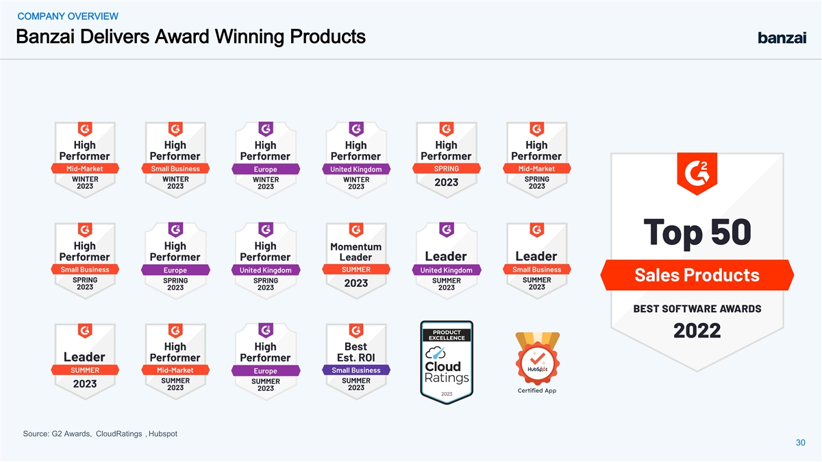 COMPANY OVERVIEW Banzai Delivers Award Winning Products Source: G2 Awards, CloudRatings , Hubspot 30