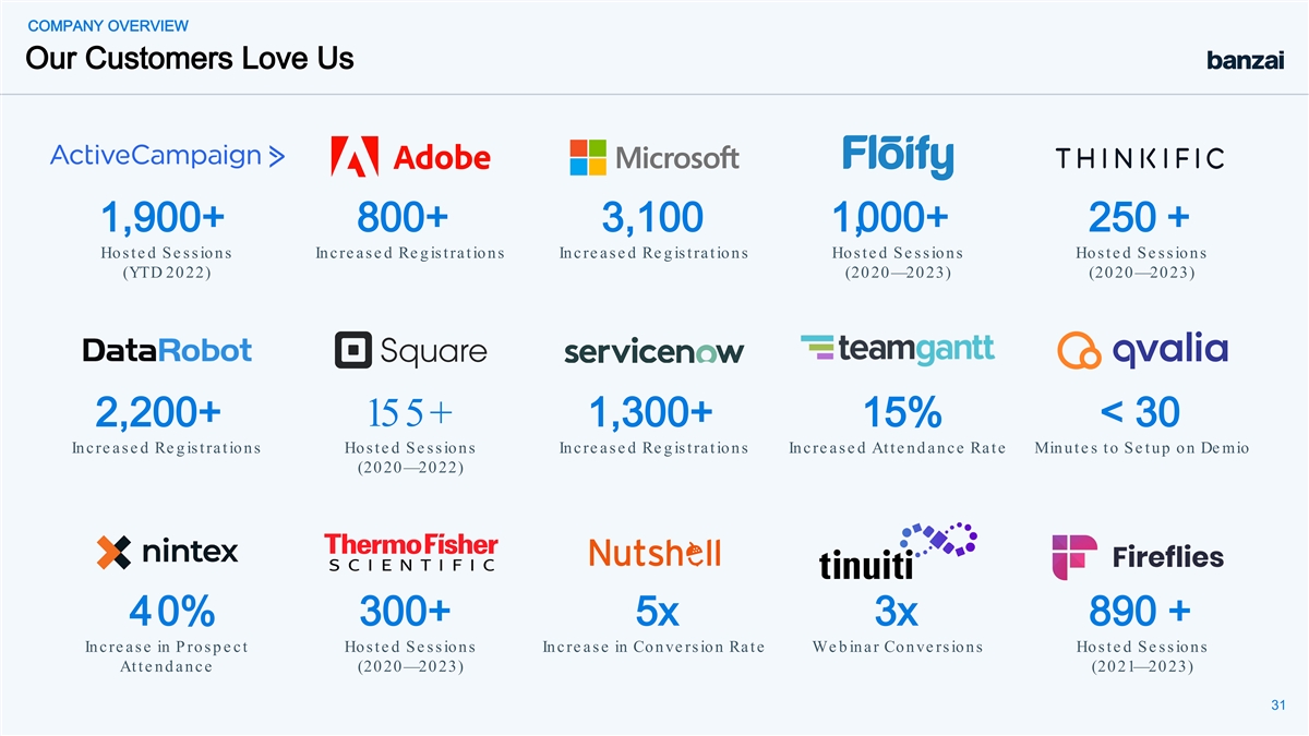 COMPANY OVERVIEW Our Customers Love Us 1,900+ 800+ 3,100 1,000+ 250 + Ho st e d Se ssio n s Inc re a s e d Re g is t ra t ions Inc re a s e d Re g is t ra t ions Hos t e d Se s s ions Hos t e d Se s s ions (YTD 20 22) (20 20 —20 23) (20 20 —20 23) 2,200+ 155+ 1,300+ 15% < 30 Inc re a s e d Re g is t ra t ions Ho st e d Se ssio n s Inc re a s e d Re g is t ra t ions In cre as e d At t e n d an ce Rat e Minut e s t o Se t up on De mio (20 20 —20 22) 40% 300+ 5x 3x 890 + Inc re a s e in P ros p e c t Ho st e d Se ssio n s Inc re a s e in Conve rs ion Ra t e We b ina r Conve rs ions Hos t e d Se s s ions At t e nd a nc e (20 20 —20 23) (20 21—20 23) 31