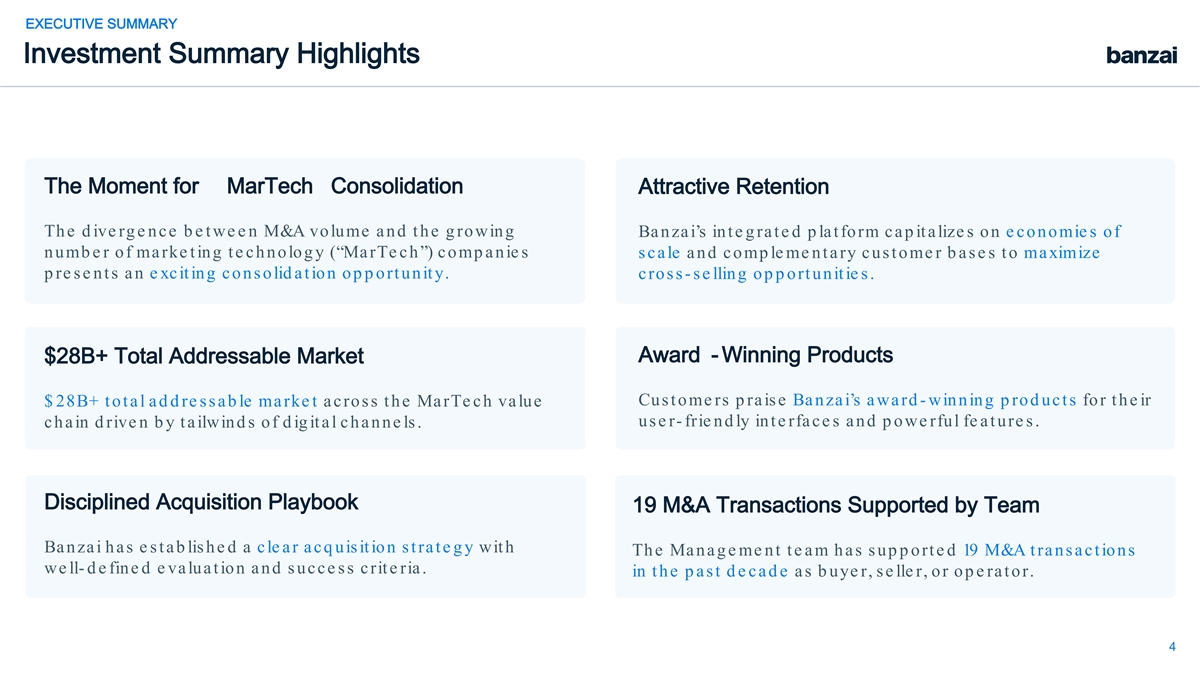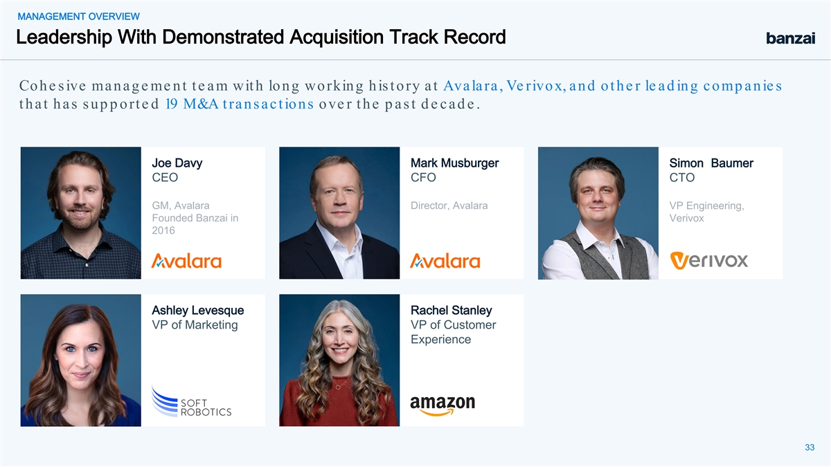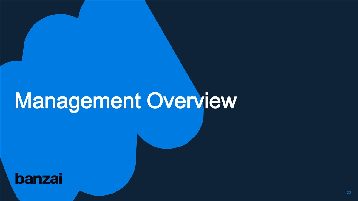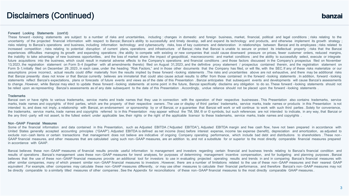 Disclaimers (Continued) Forward Looking Statements (cont’d) These forward - looking statements are subject to a number of risks and uncertainties, including : changes in domestic and foreign business, market, financial, political and legal conditions ; risks relating to the uncertainty of the projected financial information with respect to Banzai; Banzai’s ability to successfully and timely develop, sell and expand its technology and products, and otherwise implement its growth strategy ; risks relating to Banzai’s operations and business, including information technology and cybersecurity risks, loss of key customers and deterioration in relationships between Banzai and its employees ; risks related to increased competition ; risks relating to potential disruption of current plans, operations and infrastructure of Banzai; risks that Banzai is unable to secure or protect its intellectual property ; risks that the Banzai experiences difficulties managing its growth and expanding operations ; the ability to compete with existing or new companies that could cause downward pressure on prices, fewer customer orders, reduced margins, the inability to take advantage of new business opportunities, and the loss of market share ; the impact of geopolitical, macroeconomic and market conditions ; and the ability to successfully select, execute or integrate future acquisitions into the business, which could result in material adverse effects to the Company’s operations and financial conditions ; and those factors discussed in the Company’s prospectus filed on November 13, 2023 , the registration statement on Form S- 4 (together with all amendments thereto) filed on August 31, 2023 , and the definitive proxy statement / prospectus contained therein, and the registration statement on Form S- 1, initially filed on December 29, 2023 , in each case, under the heading “Risk Factors,” and in those other documents that the Company has filed, or will file, with the SEC. If any of these risks materialize or our assumptions prove incorrect, actual results could differ materially from the results implied by these forward - looking statements . The risks and uncertainties above are not exhaustive, and there may be additional risks that Banzai presently does not know or that Banzai currently believes are immaterial that could also cause actual results to differ from those contained in the forward - looking statements . In addition, forward - looking statements reflect Banzai’s expectations, plans or forecasts of future events and views as of the date of this Presentation . Banzai anticipates that subsequent events and developments will cause Banzai’s assessments to change . However, while Banzai may elect to update these forward - looking statements at some point in the future, Banzai specifically disclaims any obligation to do so. These forward - looking statements should not be relied upon as representing Banzai’s assessments as of any date subsequent to the date of this Presentation . Accordingly, undue reliance should not be placed upon the forward - looking statements . Trademarks Banzai own or have rights to various trademarks, service marks and trade names that they use in connection with the operation of their respective businesses . This Presentation also contains trademarks, service marks, trade names and copyrights of third parties, which are the property of their respective owners . The use or display of third parties’ trademarks, service marks, trade names or products in this Presentation is not intended to, and does not imply, a relationship with Banzai, an endorsement or sponsorship by or of Banzai, or a guarantee that Banzai will work or will continue to work with such third parties . Solely for convenience, the trademarks, service marks, trade names and copyrights referred to in this Presentation may appear without the TM, SM, ® or © symbols, but such references are not intended to indicate, in any way, that Banzai or the any third - party will not assert, to the fullest extent under applicable law, their rights or the right of the applicable licensor to these trademarks, service marks, trade names and copyrights . Non - GAAP Financial Measures Some of the financial information and data contained in this Presentation, such as Adjusted EBITDA (“Adjusted EBITDA”), Adjusted EBITDA margin and free cash flow, have not been prepared in accordance with United States generally accepted accounting principles (“GAAP”). Adjusted EBITDA is defined as net income (loss) before interest expense, income tax expense (benefit), depreciation and amortization, as adjusted to exclude non- cash items or certain transactions that management does not believe are indicative of ongoing Company operating performance, which include bad debt and distributions to shareholders . These non - GAAP financial measures, and other measures that are calculated using such non - GAAP measures, are an addition to, and not a substitute for or superior to the most directly comparable financial measures prepared in accordance with GAAP. Banzai believes these non- GAAP measures of financial results provide useful information to management and investors regarding certain financial and business trends relating to Banzai’s financial condition and results of operations . Banzai’s management uses these non - GAAP measures for trend analyses, for purposes of determining management incentive compensation, and for budgeting and planning purposes . Banzai believes that the use of these non - GAAP financial measures provide an additional tool for investors to use in evaluating projected operating results and trends in and in comparing Banzai’s financial measures with other similar companies, many of which present similar non - GAAP financial measures to investors . However, there are a number of limitations related to the use of these non - GAAP measures and their nearest GAAP equivalent . For example, other compa