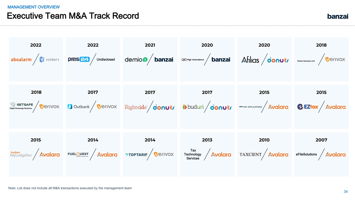 MANAGEMENT OVERVIEW Leadership With Demonstrated Acquisition Track Record Coh e s ive ma na g e me nt t e a m wit h long working h is t ory a t Avalara, Ve rivox, a nd ot h e r le a d ing c omp a nie s t h a t h a s s up p o rte d 19 M&A t ra ns a c t ion s o ve r t h e p a s t d e c a d e . Joe Davy Mark Musburger Simon Baumer CEO CFO CTO GM, Avalara Director, Avalara VP Engineering, Founded Banzai in Verivox 2016 Ashley Levesque Rachel Stanley VP of Marketing VP of Customer Experience 33