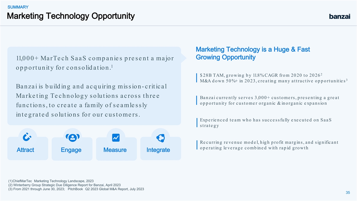 SUMMARY Marketing Technology Opportunity Marketing Technology is a Huge & Fast Growing Opportunity 11,0 0 0 + MarTe ch S a a S c o mp a n ie s p re s e n t a ma jo r 1 op p ort unit y for c ons olid a t io n. 2 $ 28B TAM, g ro win g b y 11.8% CAGR fro m 20 20 t o 20 26 3 M&A d own 50 %+ in 20 23, c re a t ing ma ny a t t ra c t ive op p ort unit ie s Ba n za i is b uild in g a n d a c q uirin g mis s io n- crit ical Ma rke t ing Te c h n o lo g y s olut ions a c ros s t h re e Ba n za i c urre n t ly se rve s 3,000+ c ust o me rs, p re se n t in g a g re a t op p ortunity for cus tome r org anic & inorg anic e xp ans ion fun c t io n s , t o c re a t e a fa mily o f s e a mle s s ly int e g ra t e d s olu t ions for our c us t ome rs . Exp e rie n c e d t e a m wh o h a s s uc c e s s fully e xe c ut e d o n Sa a S s trate g y Re c urring re ve nue mod e l, hig h p rofit ma rg ins , a nd s ig nific a nt op e rating le ve rag e comb ine d with rap id g rowth Attract Engage Measure Integrate (1) ChiefMarTec Marketing Technology Landscape, 2023 (2) Winterberry Group Strategic Due Diligence Report for Banzai, April 2023 (3) From 2021 through June 30, 2023; PitchBook Q2 2023 Global M&A Report, July 2023 35