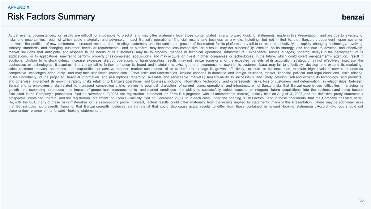 APPENDIX Risk Factors Summary Actual events, circumstances, or results are difficult or impossible to predict and may differ materially from those contemplated in any forward - looking statements made in this Presentation and are due to a variety of risks and uncertainties, each of which could materially and adversely impact Banzai’s operations, financial results and business as a whole, including, but not limited to, that Banzai: is dependent upon customer renewals, the addition of new customers, increased revenue from existing customers and the continued growth of the market for its platform ; may fail to or respond effectively to rapidly changing technology, evolving industry standards and changing customer needs or requirements, and its platform may become less competitive as a result ; may not successfully execute on its strategy and continue to develop and effectively market solutions that anticipate and respond to the needs of its customers ; may fail to properly manage its technical operations infrastructure, experience service outages, undergo delays in the deployment of its applications, or its applications may fail to perform properly ; has completed acquisitions and may acquire or invest in other companies or technologies in the future, which could divert management’s attention, result in additional dilution to its stockholders, increase expenses, disrupt operations or harm operating results ; may not realize some or all of the expected benefits of its acquisition strategy ; may not effectively integrate the businesses or technologies it acquires, if any; may fail to further enhance its brand and maintain its existing brand awareness or expand its customer base; may fail to effectively develop and expand its marketing, sales, customer service, operations, and capabilities or achieve broader market acceptance of its platform ; to manage its growth effectively, execute its business plan, maintain high levels of service or address competitive challenges adequately ; and may face significant competition . Other risks and uncertainties include changes in domestic and foreign business, market, financial, political and legal conditions ; risks relating to the uncertainty of the projected financial information and assumptions regarding available and serviceable markets ; Banzai’s ability to successfully and timely develop, sell and expand its technology and products, and otherwise implement its growth strategy ; risks relating to Banzai’s operations and business, including information technology and cybersecurity risks, loss of customers and deterioration in relationships between Banzai and its employees ; risks related to increased competition ; risks relating to potential disruption of current plans, operations and infrastructure of Banzai; risks that Banzai experiences difficulties managing its growth and expanding operations ; the impact of geopolitical, macroeconomic and market conditions ; the ability to successfully select, execute or integrate future acquisitions into the business ; and those factors discussed in the Company’s prospectus filed on November 13, 2023 , the registration statement on Form S- 4 (together with all amendments thereto) initially filed on August 31, 2023 , and the definitive proxy statement / prospectus contained therein, and the registration statement on Form S- 1initially filed on December 29, 2023 in each case, under the heading “Risk Factors,” and in those documents that the Company has filed, or will file, with the SEC. If any of these risks materialize or its assumptions prove incorrect, actual results could differ materially from the results implied by statements made in this Presentation . There may be additional risks that Banzai does not presently know or that Banzai currently believes are immaterial that could also cause actual results to differ from those contained in forward - looking statements . Accordingly, you should not place undue reliance on its forward - looking statements . 36