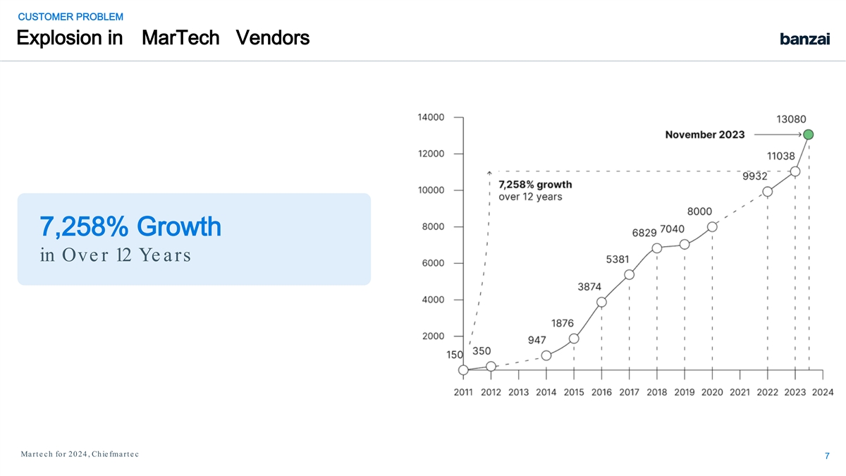 CUSTOMER PROBLEM Explosion in MarTech Vendors 7,258% Growth in Ove r 12 Ye a rs Mart e ch for 20 24 , Ch iefmart ec 7