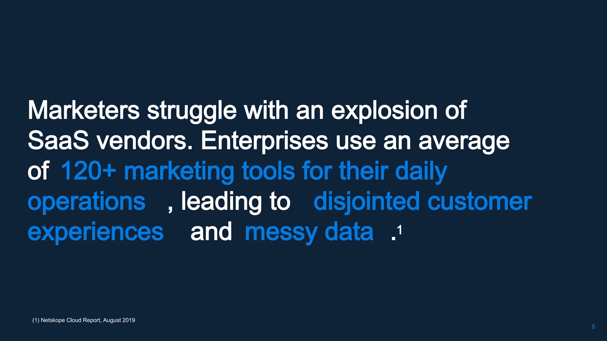 Marketers struggle with an explosion of SaaS vendors. Enterprises use an average of 120+ marketing tools for their daily operations , leading to disjointed customer 1 experiences and messy data . (1) Netskope Cloud Report, August 2019 8