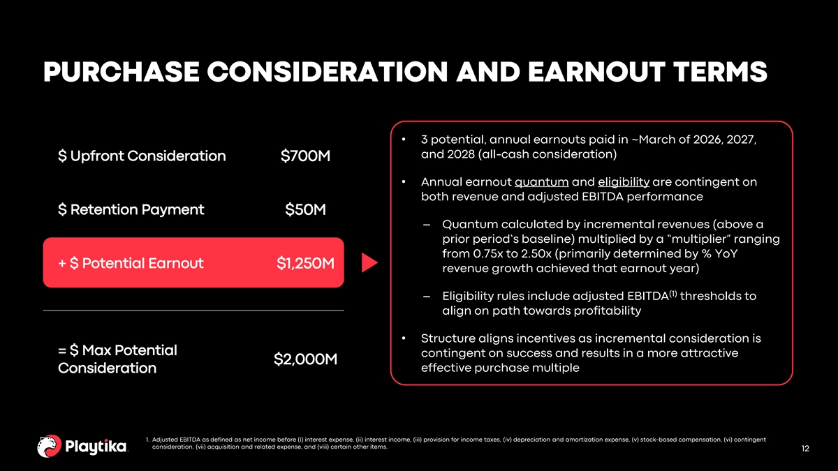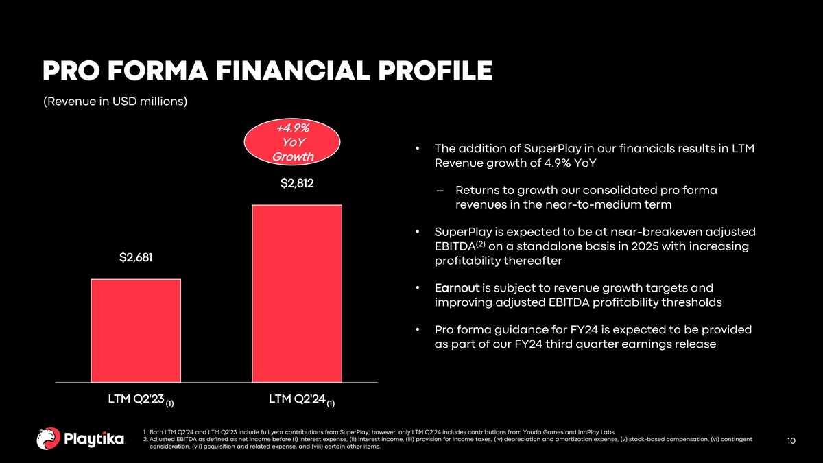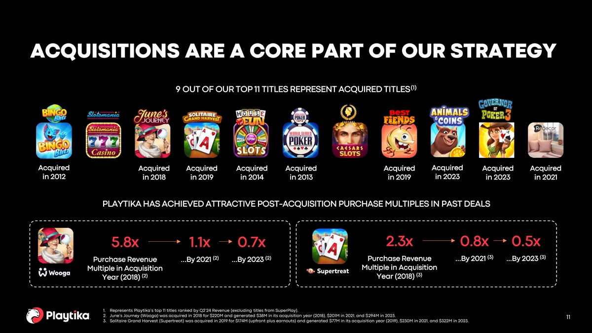 PRO FORMA FINANCIAL PROFILE (Revenue in USD millions) +4.9% YoY • The addition of SuperPlay in our financials results in LTM Growth Revenue growth of 4.9% YoY $2,812 – Returns to growth our consolidated pro forma revenues in the near-to-medium term • SuperPlay is expected to be at near-breakeven adjusted (2) EBITDA on a standalone basis in 2025 with increasing $2,681 profitability thereafter • Earnout is subject to revenue growth targets and improving adjusted EBITDA profitability thresholds • Pro forma guidance for FY24 is expected to be provided as part of our FY24 third quarter earnings release LTM Q2'23 LTM Q2'24 (1) (1) 1. Both LTM Q2’24 and LTM Q2’23 include full year contributions from SuperPlay; however, only LTM Q2’24 includes contributions from Youda Games and InnPlay Labs. 2. Adjusted EBITDA as defined as net income before (i) interest expense, (ii) interest income, (iii) provision for income taxes, (iv) depreciation and amortization expense, (v) stock-based compensation, (vi) contingent 10 consideration, (vii) acquisition and related expense, and (viii) certain other items.