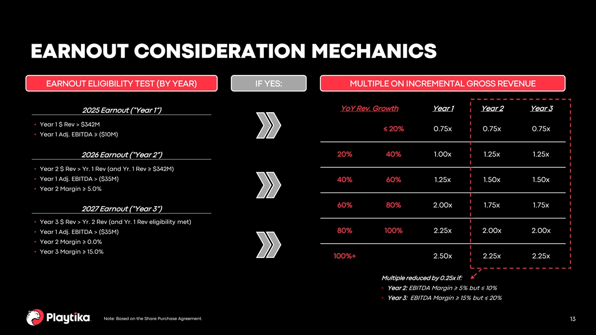 PURCHASE CONSIDERATION AND EARNOUT TERMS • 3 potential, annual earnouts paid in ~March of 2026, 2027, and 2028 (all-cash consideration) $ Upfront Consideration $700M • Annual earnout quantum and eligibility are contingent on both revenue and adjusted EBITDA performance $ Retention Payment $50M – Quantum calculated by incremental revenues (above a prior period’s baseline) multiplied by a “multiplier” ranging from 0.75x to 2.50x (primarily determined by % YoY + $ Potential Earnout $1,250M revenue growth achieved that earnout year) (1) – Eligibility rules include adjusted EBITDA thresholds to align on path towards profitability • Structure aligns incentives as incremental consideration is = $ Max Potential contingent on success and results in a more attractive $2,000M effective purchase multiple Consideration 1. Adjusted EBITDA as defined as net income before (i) interest expense, (ii) interest income, (iii) provision for income taxes, (iv) depreciation and amortization expense, (v) stock-based compensation, (vi) contingent consideration, (vii) acquisition and related expense, and (viii) certain other items. 12