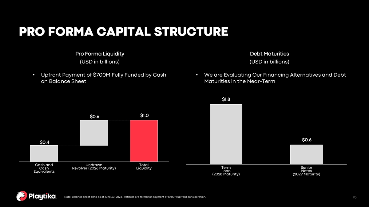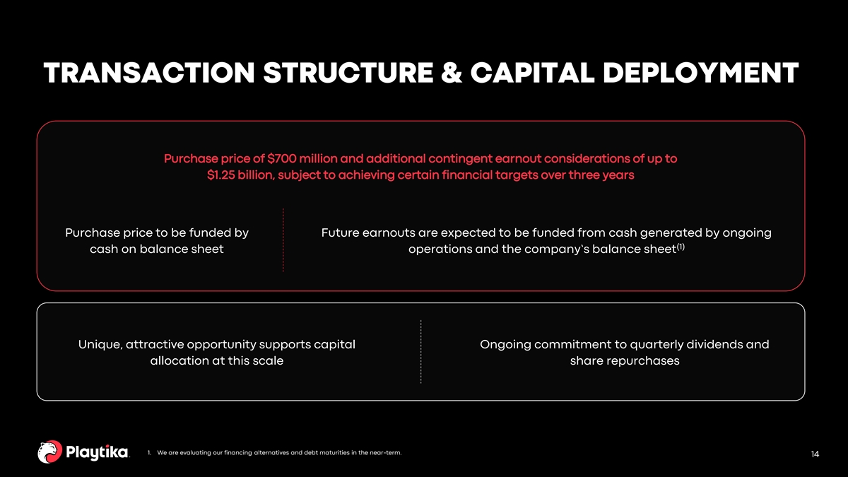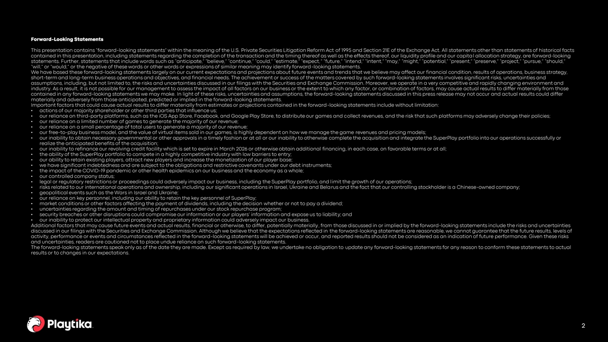 Forward-Looking Statements This presentation contains “forward-looking statements” within the meaning of the U.S. Private Securities Litigation Reform Act of 1995 and Section 21E of the Exchange Act. All statements other than statements of historical facts contained in this presentation, including statements regarding the completion of the transaction and the timing thereof as well as the effects thereof, our liquidity profile and our capital allocation strategy, are forward-looking statements. Further, statements that include words such as “anticipate,” “believe,” “continue,” “could,” “estimate,” “expect,” “future,” “intend,” “intent,” “may,” “might,” “potential,” “present,” “preserve,” “project,” “pursue,” “should,” “will,” or “would,” or the negative of these words or other words or expressions of similar meaning may identify forward-looking statements. We have based these forward-looking statements largely on our current expectations and projections about future events and trends that we believe may affect our financial condition, results of operations, business strategy, short-term and long-term business operations and objectives, and financial needs. The achievement or success of the matters covered by such forward-looking statements involves significant risks, uncertainties and assumptions, including, but not limited to, the risks and uncertainties discussed in our filings with the Securities and Exchange Commission. Moreover, we operate in a very competitive and rapidly changing environment and industry. As a result, it is not possible for our management to assess the impact of all factors on our business or the extent to which any factor, or combination of factors, may cause actual results to differ materially from those contained in any forward-looking statements we may make. In light of these risks, uncertainties and assumptions, the forward-looking statements discussed in this press release may not occur and actual results could differ materially and adversely from those anticipated, predicted or implied in the forward-looking statements. Important factors that could cause actual results to differ materially from estimates or projections contained in the forward-looking statements include without limitation: • actions of our majority shareholder or other third parties that influence us; • our reliance on third-party platforms, such as the iOS App Store, Facebook, and Google Play Store, to distribute our games and collect revenues, and the risk that such platforms may adversely change their policies; • our reliance on a limited number of games to generate the majority of our revenue; • our reliance on a small percentage of total users to generate a majority of our revenue; • our free-to-play business model, and the value of virtual items sold in our games, is highly dependent on how we manage the game revenues and pricing models; • our inability to obtain necessary governmental or other approvals in a timely fashion or at all or our inability to otherwise complete the acquisition and integrate the SuperPlay portfolio into our operations successfully or realize the anticipated benefits of the acquisition; • our inability to refinance our revolving credit facility which is set to expire in March 2026 or otherwise obtain additional financing, in each case, on favorable terms or at all; • the ability of the SuperPlay portfolio to compete in a highly competitive industry with low barriers to entry; • our ability to retain existing players, attract new players and increase the monetization of our player base; • we have significant indebtedness and are subject to the obligations and restrictive covenants under our debt instruments; • the impact of the COVID-19 pandemic or other health epidemics on our business and the economy as a whole; • our controlled company status; • legal or regulatory restrictions or proceedings could adversely impact our business, including the SuperPlay portfolio, and limit the growth of our operations; • risks related to our international operations and ownership, including our significant operations in Israel, Ukraine and Belarus and the fact that our controlling stockholder is a Chinese-owned company; • geopolitical events such as the Wars in Israel and Ukraine; • our reliance on key personnel, including our ability to retain the key personnel of SuperPlay; • market conditions or other factors affecting the payment of dividends, including the decision whether or not to pay a dividend; • uncertainties regarding the amount and timing of repurchases under our stock repurchase program; • security breaches or other disruptions could compromise our information or our players’ information and expose us to liability; and • our inability to protect our intellectual property and proprietary information could adversely impact our business. Additional factors that may cause future events and actual results, financial or otherwise, to differ, potentially materially, from those discussed in or implied by the forward-looking statements include the risks and uncertainties discussed in our filings with the Securities and Exchange Commission. Although we believe that the expectations reflected in the forward-looking statements are reasonable, we cannot guarantee that the future results, levels of activity, performance or events and circumstances reflected in the forward-looking statements will be achieved or occur, and reported results should not be considered as an indication of future performance. Given these risks and uncertainties, readers are cautioned not to place undue reliance on such forward-looking statements. The forward-looking statements speak only as of the date they are made. Except as required by law, we undertake no obligation to update any forward-looking statements for any reason to conform these statements to actual results or to cha