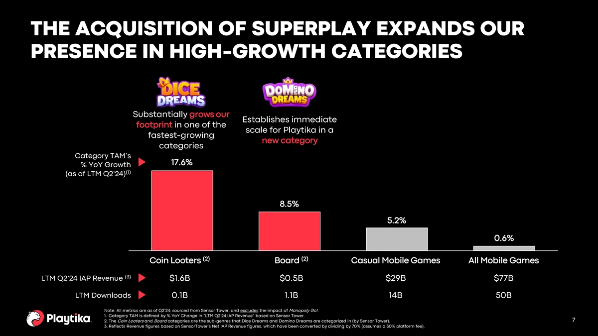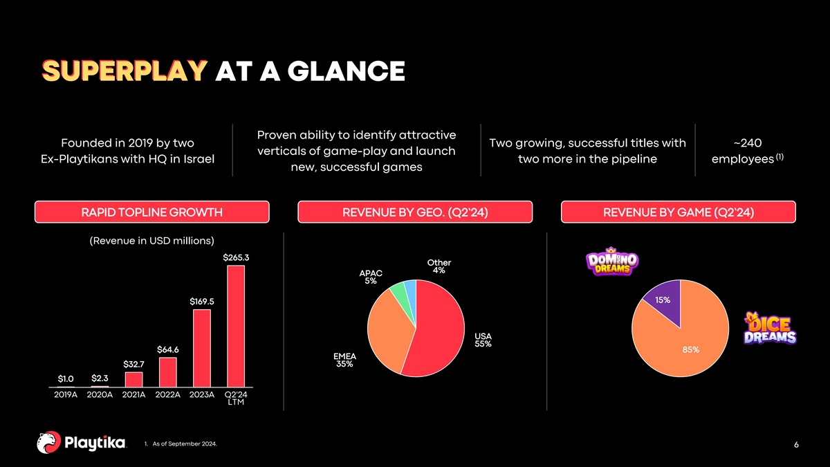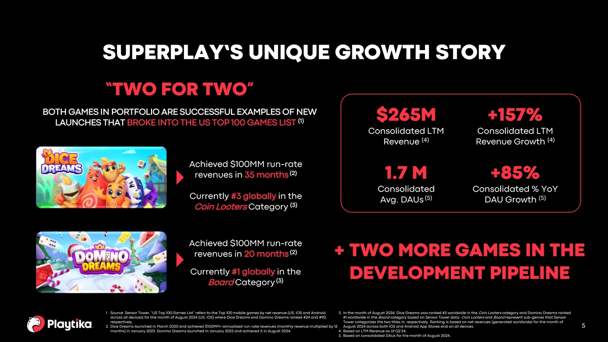 SUPERPLAY’S UNIQUE GROWTH STORY “TWO FOR TWO” BOTH GAMES IN PORTFOLIO ARE SUCCESSFUL EXAMPLES OF NEW $265M +157% (1) LAUNCHES THAT BROKE INTO THE US TOP 100 GAMES LIST Consolidated LTM Consolidated LTM (4) (4) Revenue Revenue Growth Achieved $100MM run-rate (2) revenues in 35 months 1.7 M +85% Consolidated Consolidated % YoY Currently #3 globally in the (5) (5) Avg. DAUs DAU Growth (3) Coin Looters Category Achieved $100MM run-rate (2) revenues in 20 months + TWO MORE GAMES IN THE Currently #1 globally in the DEVELOPMENT PIPELINE (3) Board Category 1. Source: Sensor Tower. “US Top 100 Games List” refers to the Top 100 mobile games by net revenue (US, iOS and Android, 3. In the month of August 2024, Dice Dreams was ranked #3 worldwide in the Coin Looters category and Domino Dreams ranked across all devices) for the month of August 2024 (US, iOS) where Dice Dreams and Domino Dreams ranked #24 and #90, #1 worldwide in the Board category based on Sensor Tower data. Coin Looters and Board represent sub-genres that Sensor respectively. Tower categorizes the two titles in, respectively. Ranking is based on net revenues (generated worldwide) for the month of 2. Dice Dreams launched in March 2020 and achieved $100MM+ annualized run-rate revenues (monthly revenue multiplied by 12 August 2024 across both iOS and Android App Stores and on all devices. 5 months) in January 2023. Domino Dreams launched in January 2023 and achieved it in August 2024. 4. Based on LTM Revenue as of Q2’24. 5. Based on consolidated DAUs for the month of August 2024.