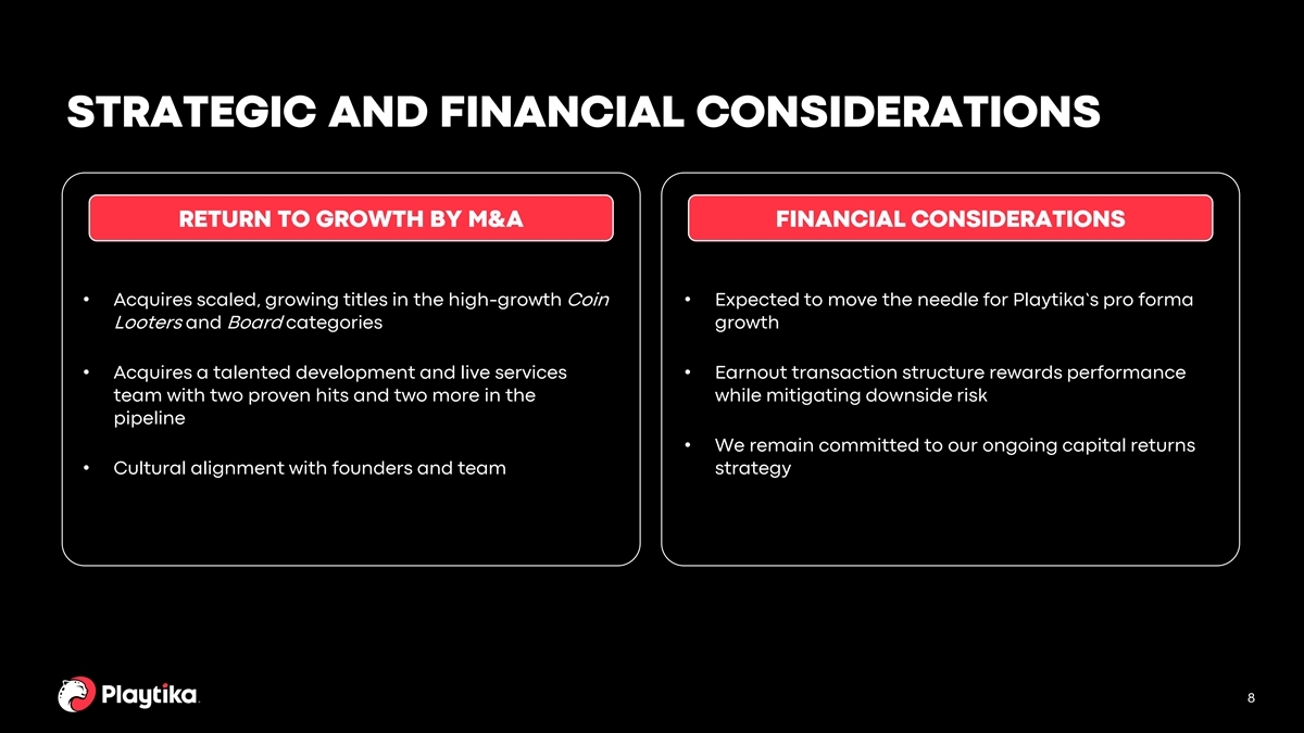 THE ACQUISITION OF SUPERPLAY EXPANDS OUR PRESENCE IN HIGH-GROWTH CATEGORIES Substantially grows our Establishes immediate footprint in one of the scale for Playtika in a fastest-growing new category categories Category TAM’s 20 17.6% % YoY Growth 18 18 (1) (as of LTM Q2’24) 16 14 12 10 8.5% 9 8 5.2% 5 6 4 0.6% 1 2 0 Coin Looter Board All Casual All Mobile (2) (2) Coin Looters Board Casual Mobile Games All Mobile Games (3) LTM Q2’24 IAP Revenue $1.6B $0.5B $29B $77B LTM Downloads 0.1B 1.1B 14B 50B Note: All metrics are as of Q2’24, sourced from Sensor Tower, and excludes the impact of Monopoly Go!. 1. Category TAM is defined by % YoY Change in “LTM Q2’24 IAP Revenue” based on Sensor Tower. 2. The Coin Looters and Board categories are the sub-genres that Dice Dreams and Domino Dreams are categorized in (by Sensor Tower). 7 3. Reflects Revenue figures based on SensorTower’s Net IAP Revenue figures, which have been converted by dividing by 70% (assumes a 30% platform fee).