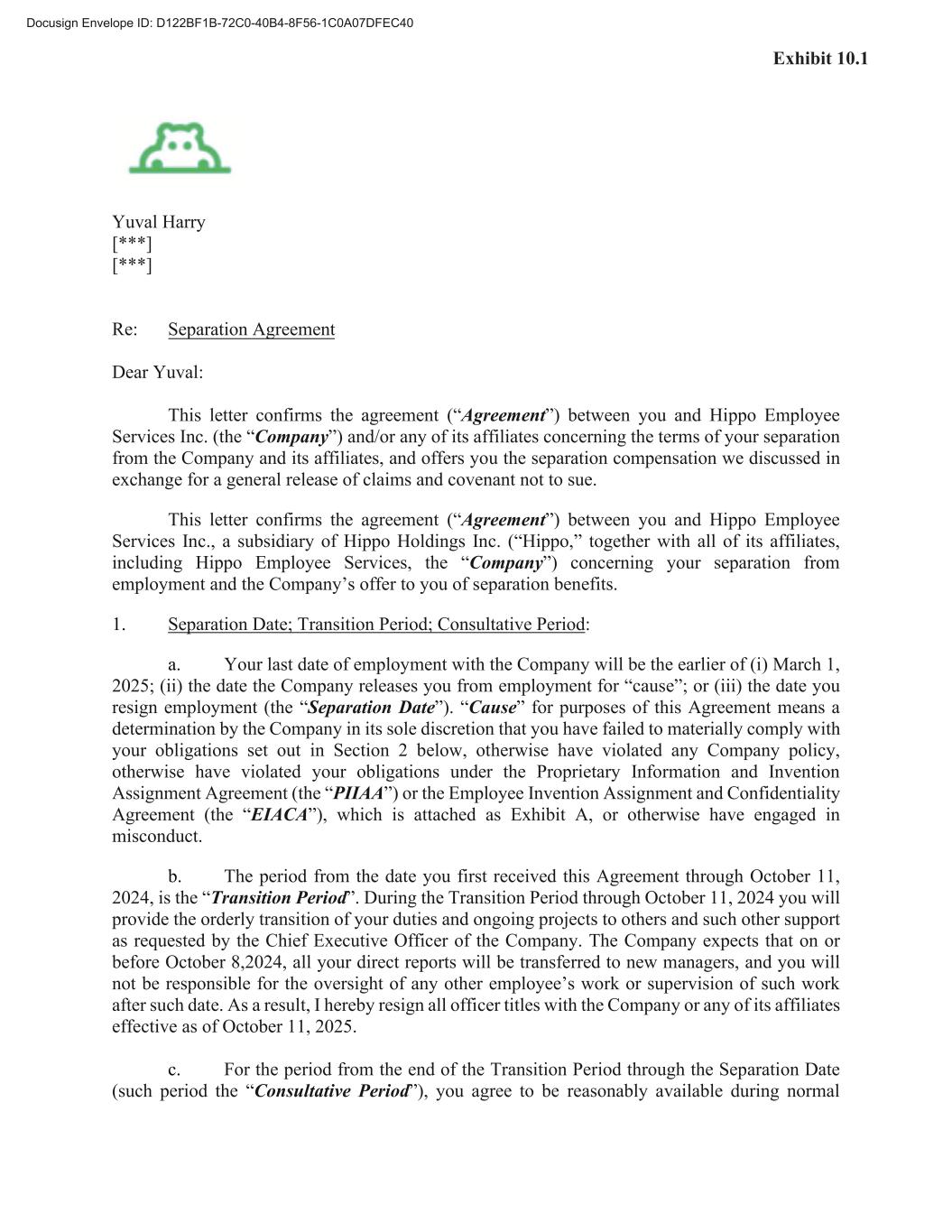 Yuval Harry [***] [***] Re: Separation Agreement Dear Yuval: This letter confirms the agreement (“Agreement”) between you and Hippo Employee Services Inc. (the “Company”) and/or any of its affiliates concerning the terms of your separation from the Company and its affiliates, and offers you the separation compensation we discussed in exchange for a general release of claims and covenant not to sue. This letter confirms the agreement (“Agreement”) between you and Hippo Employee Services Inc., a subsidiary of Hippo Holdings Inc. (“Hippo,” together with all of its affiliates, including Hippo Employee Services, the “Company”) concerning your separation from employment and the Company’s offer to you of separation benefits. 1. Separation Date; Transition Period; Consultative Period: a. Your last date of employment with the Company will be the earlier of (i) March 1, 2025; (ii) the date the Company releases you from employment for “cause”; or (iii) the date you resign employment (the “Separation Date”). “Cause” for purposes of this Agreement means a determination by the Company in its sole discretion that you have failed to materially comply with your obligations set out in Section 2 below, otherwise have violated any Company policy, otherwise have violated your obligations under the Proprietary Information and Invention Assignment Agreement (the “PIIAA”) or the Employee Invention Assignment and Confidentiality Agreement (the “EIACA”), which is attached as Exhibit A, or otherwise have engaged in misconduct. b. The period from the date you first received this Agreement through October 11, 2024, is the “Transition Period”. During the Transition Period through October 11, 2024 you will provide the orderly transition of your duties and ongoing projects to others and such other support as requested by the Chief Executive Officer of the Company. The Company expects that on or before October 8,2024, all your direct reports will be transferred to new managers, and you will not be responsible for the oversight of any other employee’s work or supervision of such work after such date. As a result, I hereby resign all officer titles with the Company or any of its affiliates effective as of October 11, 2025. c. For the period from the end of the Transition Period through the Separation Date (such period the “Consultative Period”), you agree to be reasonably available during normal Exhibit 10.1