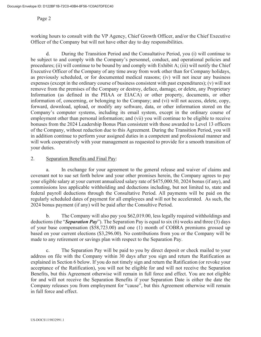 Page 2 US-DOCS\119832991.1 working hours to consult with the VP Agency, Chief Growth Officer, and/or the Chief Executive Officer of the Company but will not have other day to day responsibilities. d. During the Transition Period and the Consultative Period, you (i) will continue to be subject to and comply with the Company’s personnel, conduct, and operational policies and procedures; (ii) will continue to be bound by and comply with Exhibit A; (iii) will notify the Chief Executive Officer of the Company of any time away from work other than for Company holidays, as previously scheduled, or for documented medical reasons; (iv) will not incur any business expenses (except in the ordinary course of business consistent with past expenditures); (v) will not remove from the premises of the Company or destroy, deface, damage, or delete, any Proprietary Information (as defined in the PIIAA or EIACA) or other property, documents, or other information of, concerning, or belonging to the Company; and (vi) will not access, delete, copy, forward, download, upload, or modify any software, data, or other information stored on the Company’s computer systems, including its email system, except in the ordinary course of employment other than personal information; and (vii) you will continue to be eligible to receive bonuses from the 2024 Leadership Bonus Plan consistent with those awarded to Level 13 officers of the Company, without reduction due to this Agreement. During the Transition Period, you will in addition continue to perform your assigned duties in a competent and professional manner and will work cooperatively with your management as requested to provide for a smooth transition of your duties. 2. Separation Benefits and Final Pay: a. In exchange for your agreement to the general release and waiver of claims and covenant not to sue set forth below and your other promises herein, the Company agrees to pay your eligible salary at your current annualized salary rate of $475,000.50, 2024 bonus (if any), and commissions less applicable withholding and deductions including, but not limited to, state and federal payroll deductions through the Consultative Period. All payments will be paid on the regularly scheduled dates of payment for all employees and will not be accelerated. As such, the 2024 bonus payment (if any) will be paid after the Consultive Period. b. The Company will also pay you $62,019.00, less legally required withholdings and deductions (the “Separation Pay”). The Separation Pay is equal to six (6) weeks and three (3) days of your base compensation ($58,723.00) and one (1) month of COBRA premiums grossed up based on your current elections ($3,296.00). No contributions from you or the Company will be made to any retirement or savings plan with respect to the Separation Pay. c. The Separation Pay will be paid to you by direct deposit or check mailed to your address on file with the Company within 30 days after you sign and return the Ratification as explained in Section 6 below. If you do not timely sign and return the Ratification (or revoke your acceptance of the Ratification), you will not be eligible for and will not receive the Separation Benefits, but this Agreement otherwise will remain in full force and effect. You are not eligible for and will not receive the Separation Benefits if your Separation Date is either the date the Company releases you from employment for “cause”, but this Agreement otherwise will remain in full force and effect.