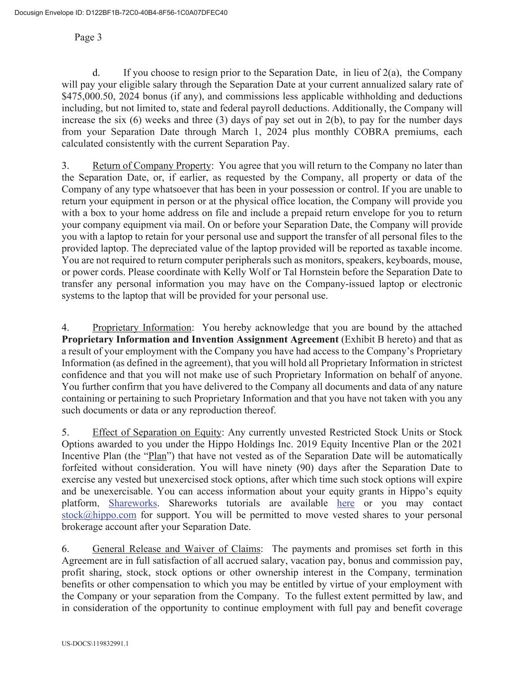 Page 3 US-DOCS\119832991.1 d. If you choose to resign prior to the Separation Date, in lieu of 2(a), the Company will pay your eligible salary through the Separation Date at your current annualized salary rate of $475,000.50, 2024 bonus (if any), and commissions less applicable withholding and deductions including, but not limited to, state and federal payroll deductions. Additionally, the Company will increase the six (6) weeks and three (3) days of pay set out in 2(b), to pay for the number days from your Separation Date through March 1, 2024 plus monthly COBRA premiums, each calculated consistently with the current Separation Pay. 3. Return of Company Property: You agree that you will return to the Company no later than the Separation Date, or, if earlier, as requested by the Company, all property or data of the Company of any type whatsoever that has been in your possession or control. If you are unable to return your equipment in person or at the physical office location, the Company will provide you with a box to your home address on file and include a prepaid return envelope for you to return your company equipment via mail. On or before your Separation Date, the Company will provide you with a laptop to retain for your personal use and support the transfer of all personal files to the provided laptop. The depreciated value of the laptop provided will be reported as taxable income. You are not required to return computer peripherals such as monitors, speakers, keyboards, mouse, or power cords. Please coordinate with Kelly Wolf or Tal Hornstein before the Separation Date to transfer any personal information you may have on the Company-issued laptop or electronic systems to the laptop that will be provided for your personal use. 4. Proprietary Information: You hereby acknowledge that you are bound by the attached Proprietary Information and Invention Assignment Agreement (Exhibit B hereto) and that as a result of your employment with the Company you have had access to the Company’s Proprietary Information (as defined in the agreement), that you will hold all Proprietary Information in strictest confidence and that you will not make use of such Proprietary Information on behalf of anyone. You further confirm that you have delivered to the Company all documents and data of any nature containing or pertaining to such Proprietary Information and that you have not taken with you any such documents or data or any reproduction thereof. 5. Effect of Separation on Equity: Any currently unvested Restricted Stock Units or Stock Options awarded to you under the Hippo Holdings Inc. 2019 Equity Incentive Plan or the 2021 Incentive Plan (the “Plan”) that have not vested as of the Separation Date will be automatically forfeited without consideration. You will have ninety (90) days after the Separation Date to exercise any vested but unexercised stock options, after which time such stock options will expire and be unexercisable. You can access information about your equity grants in Hippo’s equity platform, Shareworks. Shareworks tutorials are available here or you may contact stock@hippo.com for support. You will be permitted to move vested shares to your personal brokerage account after your Separation Date. 6. General Release and Waiver of Claims: The payments and promises set forth in this Agreement are in full satisfaction of all accrued salary, vacation pay, bonus and commission pay, profit sharing, stock, stock options or other ownership interest in the Company, termination benefits or other compensation to which you may be entitled by virtue of your employment with the Company or your separation from the Company. To the fullest extent permitted by law, and in consideration of the opportunity to continue employment with full pay and benefit coverage