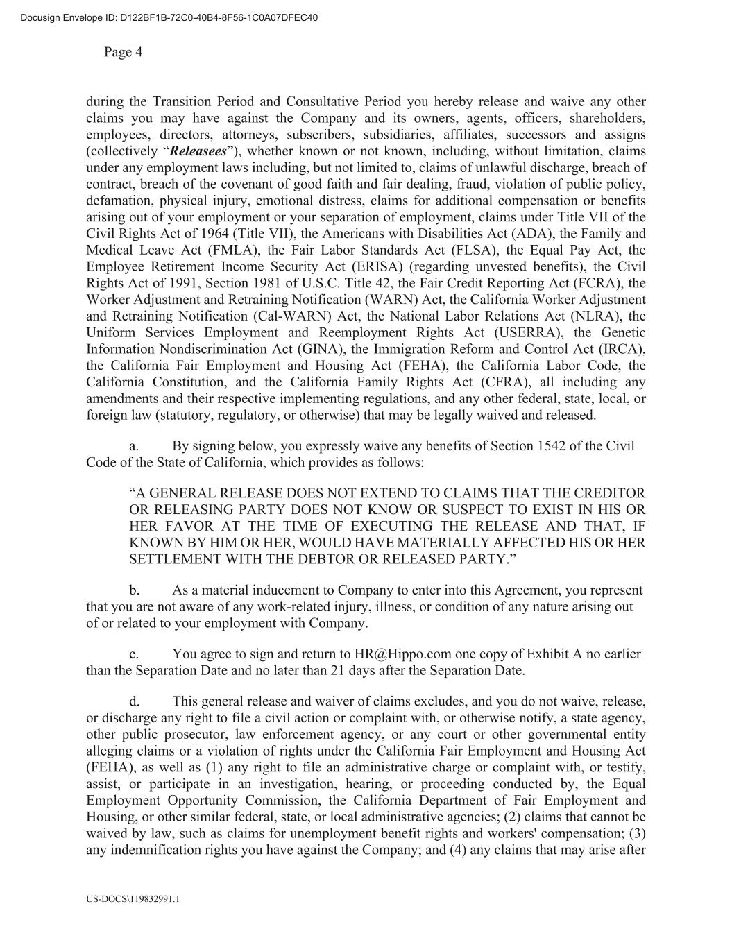 Page 4 US-DOCS\119832991.1 during the Transition Period and Consultative Period you hereby release and waive any other claims you may have against the Company and its owners, agents, officers, shareholders, employees, directors, attorneys, subscribers, subsidiaries, affiliates, successors and assigns (collectively “Releasees”), whether known or not known, including, without limitation, claims under any employment laws including, but not limited to, claims of unlawful discharge, breach of contract, breach of the covenant of good faith and fair dealing, fraud, violation of public policy, defamation, physical injury, emotional distress, claims for additional compensation or benefits arising out of your employment or your separation of employment, claims under Title VII of the Civil Rights Act of 1964 (Title VII), the Americans with Disabilities Act (ADA), the Family and Medical Leave Act (FMLA), the Fair Labor Standards Act (FLSA), the Equal Pay Act, the Employee Retirement Income Security Act (ERISA) (regarding unvested benefits), the Civil Rights Act of 1991, Section 1981 of U.S.C. Title 42, the Fair Credit Reporting Act (FCRA), the Worker Adjustment and Retraining Notification (WARN) Act, the California Worker Adjustment and Retraining Notification (Cal-WARN) Act, the National Labor Relations Act (NLRA), the Uniform Services Employment and Reemployment Rights Act (USERRA), the Genetic Information Nondiscrimination Act (GINA), the Immigration Reform and Control Act (IRCA), the California Fair Employment and Housing Act (FEHA), the California Labor Code, the California Constitution, and the California Family Rights Act (CFRA), all including any amendments and their respective implementing regulations, and any other federal, state, local, or foreign law (statutory, regulatory, or otherwise) that may be legally waived and released. a. By signing below, you expressly waive any benefits of Section 1542 of the Civil Code of the State of California, which provides as follows: “A GENERAL RELEASE DOES NOT EXTEND TO CLAIMS THAT THE CREDITOR OR RELEASING PARTY DOES NOT KNOW OR SUSPECT TO EXIST IN HIS OR HER FAVOR AT THE TIME OF EXECUTING THE RELEASE AND THAT, IF KNOWN BY HIM OR HER, WOULD HAVE MATERIALLY AFFECTED HIS OR HER SETTLEMENT WITH THE DEBTOR OR RELEASED PARTY.” b. As a material inducement to Company to enter into this Agreement, you represent that you are not aware of any work-related injury, illness, or condition of any nature arising out of or related to your employment with Company. c. You agree to sign and return to HR@Hippo.com one copy of Exhibit A no earlier than the Separation Date and no later than 21 days after the Separation Date. d. This general release and waiver of claims excludes, and you do not waive, release, or discharge any right to file a civil action or complaint with, or otherwise notify, a state agency, other public prosecutor, law enforcement agency, or any court or other governmental entity alleging claims or a violation of rights under the California Fair Employment and Housing Act (FEHA), as well as (1) any right to file an administrative charge or complaint with, or testify, assist, or participate in an investigation, hearing, or proceeding conducted by, the Equal Employment Opportunity Commission, the California Department of Fair Employment and Housing, or other similar federal, state, or local administrative agencies; (2) claims that cannot be waived by law, such as claims for unemployment benefit rights and workers' compensation; (3) any indemnification rights you have against the Company; and (4) any claims that may arise after
